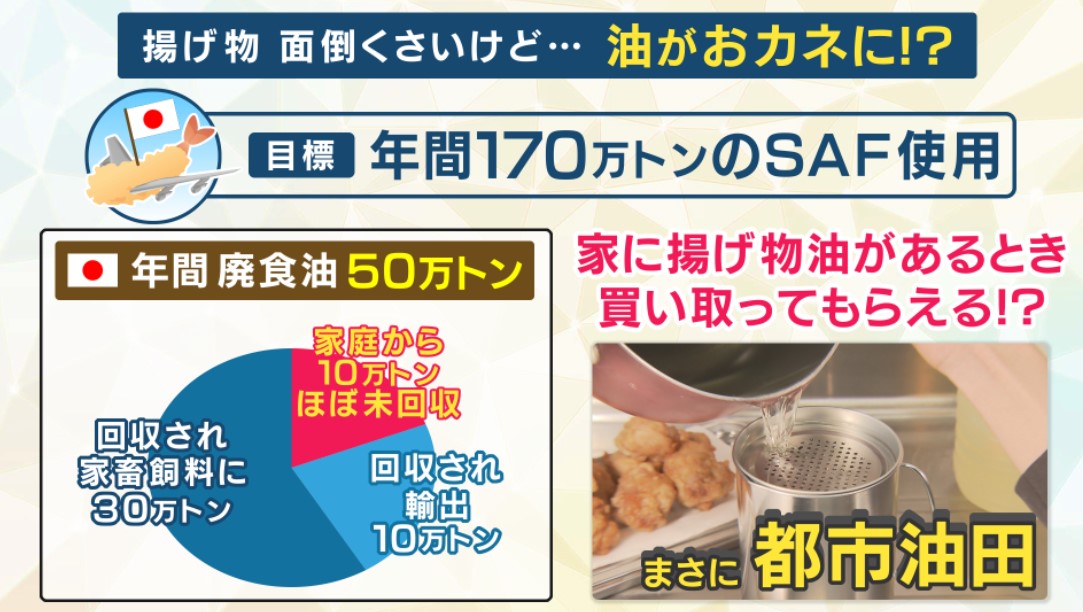 しかし、すでに激しい奪い合いが起きている中、これまでほとんど回収されてこなかった家庭から出た”揚げ物油”を集めるなどして、何とか「SAF」を作る原料を確保しようと動き出しています。