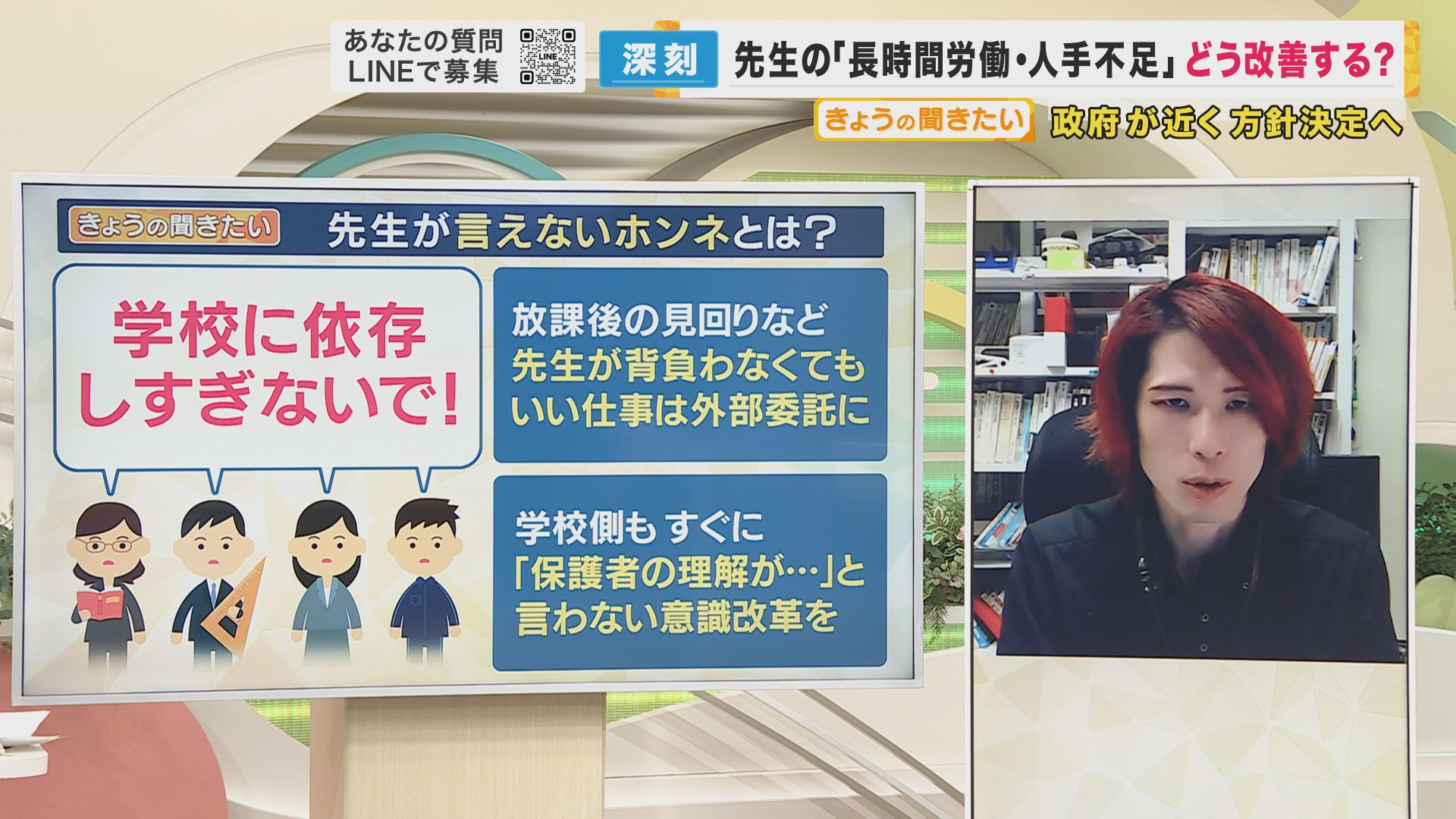 「土日や夏休みなど学校の外でトラブルが起きた時に、保護者が電話を学校にしてくる。平日も夜遅くでも学校に連絡をする。学校の先生は何でも対応してくれるものだ、と社会全体が思い込んでしまっています。本当は社会の仕組みの中で、どうやって子どもの面倒を見ていくのかを考えなければいけないですが、現状は先生のタダ働きが”受け皿”になってしまっている状況です」