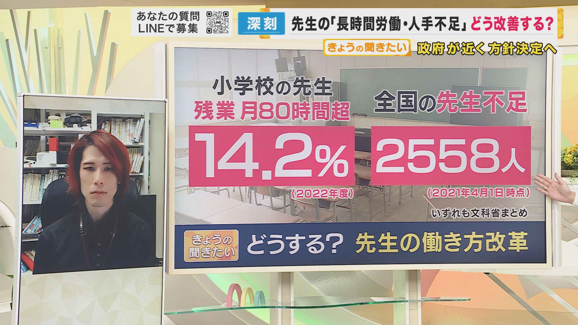 文部科学省の調査によると、過労死ラインである月80時間以上の残業をしている小学校の先生は14.2%いて、全国で先生が2500人以上も足りない状況があるということです。