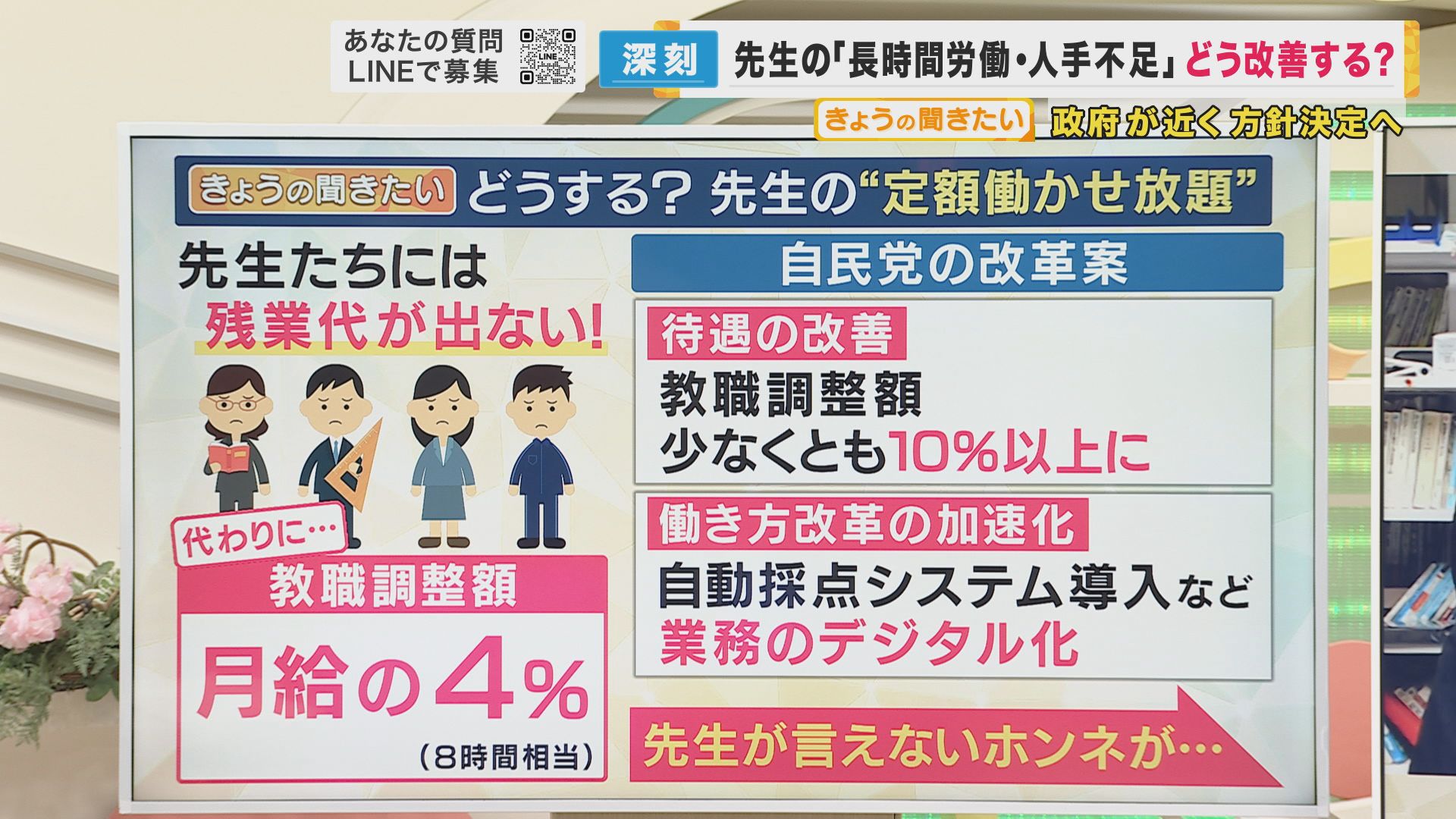 「残業代が出ないのは大きな問題で、他の公務員は残業代が出るため、先生だけ”特別扱い”になっています。私立の学校では残業代が出ている学校もあるので、公立の学校の先生だけがこのようなルールに縛られています。野党などは、調整額を止めて、時間に見合った残業代を出して『残業を見える化』するべきという声も上がっています。相当な額にはなると思いますが、法律を変えて対応することはできないことはありません」