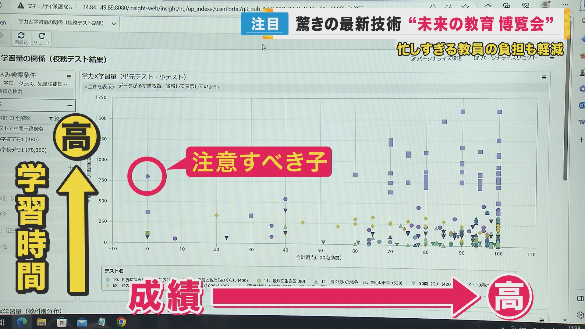 今や生徒一人1台のタブレット端末の使用が当たり前となった授業形態。このタブレットで、生徒が学習した時間と成績の相関関係から、”気になる子”を客観的に「見える化」させるというものです。