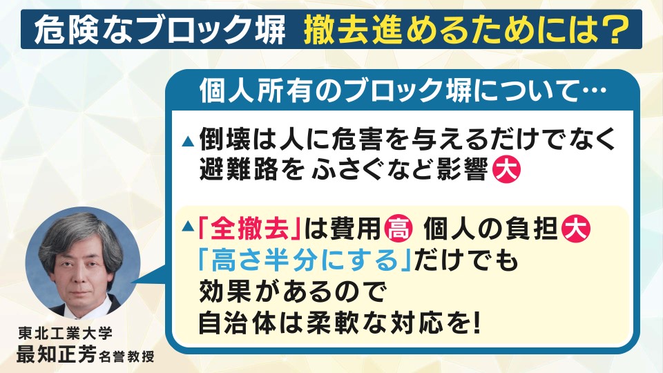 そこで、ブロック塀の高さを半分にする工事を行うなどの対策でも効果はあるということで、自治体は柔軟な対応をして欲しいとしています。