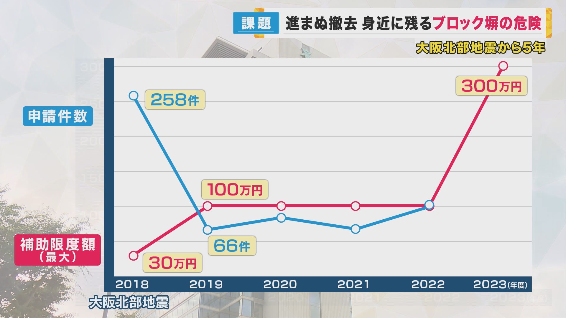 一方で、民間のブロック塀については対策が思うように進んでいません。高槻市の場合、地震直後にブロック塀の撤去費用を補助する制度を開始し、年々その上限額を引き上げてきました。しかし、申請件数は初年度以降、伸び悩んでいます。