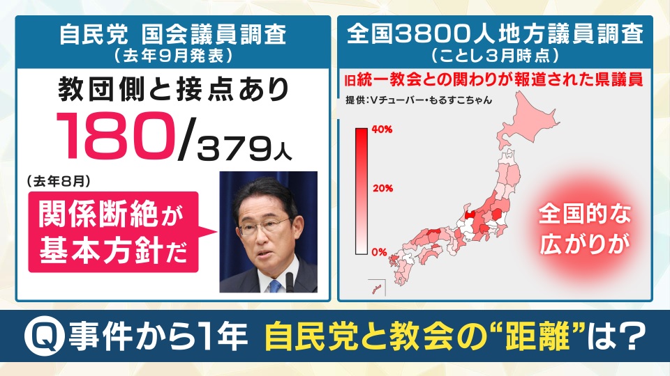 去年の9月時点の自民党の国会議員の調査では、教団側と接点があったのは379人中180人、岸田首相も、「関係断絶が基本方針」だと話しています。 そして、地方議員についてもVチューバー(もるすこちゃん)による全国3800人の地方議員についての調査では、全国の地図で分かるように濃淡があるものの、全国的な広がりがあり、断ち切れていないようにみえます。