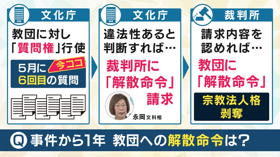 そして旧統一教会を巡って、注目されているのが“解散命令”が出されるのかどうかです。旧統一教会を巡っては、文化庁が教団に対し、「質問権」を行使し、5月に6回目の質問を行い、教団から回答が出されています。今後、文化庁が違法性があると判断すれば、裁判所に「解散命令」を請求します。そして、裁判所が請求内容を認めれば教団に「解散命令」が出され、宗教法人格が剥奪されます。