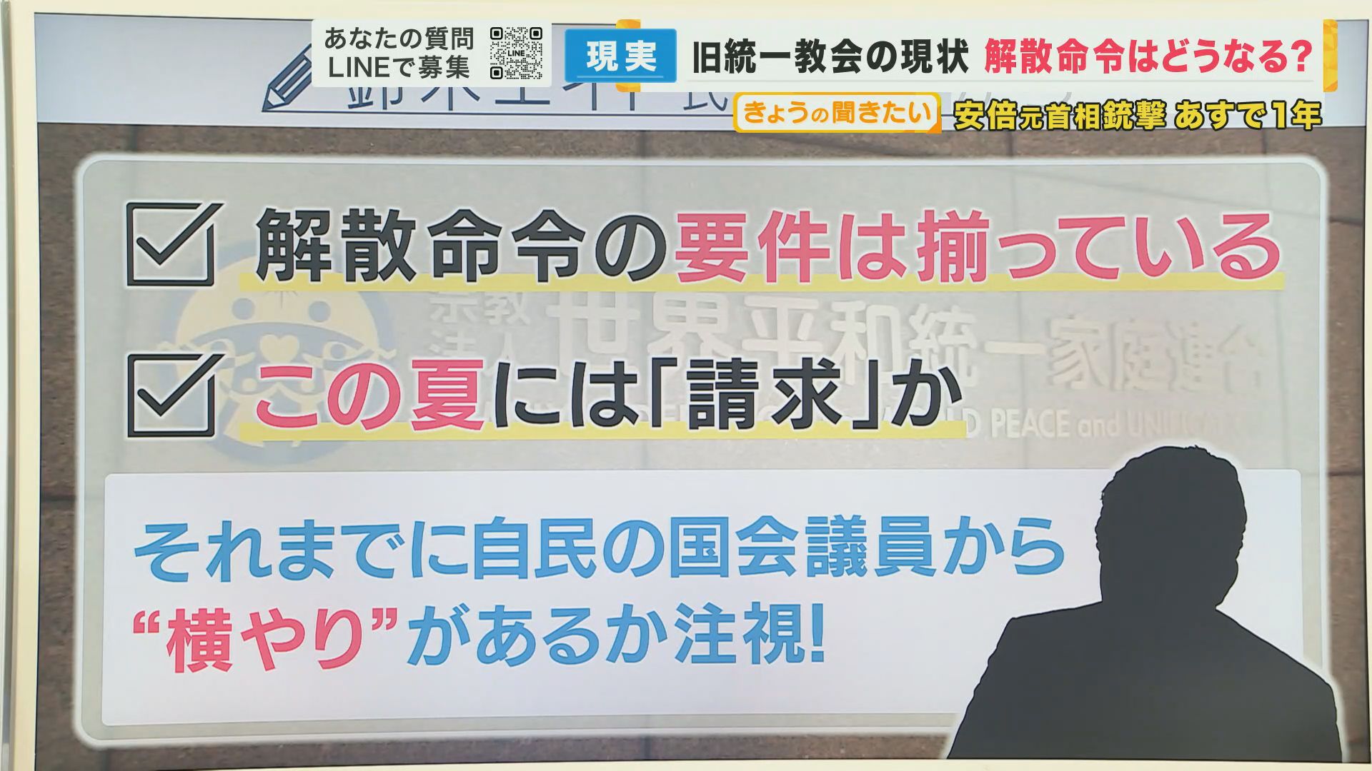 「解散命令の要件は団体に対する悪質性、組織性 そして継続性なんですね。旧統一教会の場合は完璧に揃っています。ただ、民法上の不法行為なので、その教団の代表役員が直接、犯罪行為を犯したとかそういうことではない。あくまで信者にやらせている。責任を信者に押し付けている分、なかなかそこが立証しづらいというところで、文化庁がかなり証拠調べ に手間取ってきた 。文化庁に返って来る資料ですが、教団側が自分に不利な資料を出すわけがないので、文化庁が別にちゃんといろんな資料を集めて内部資料であるとか、いろんな被害者の情報なども集めた上でようやく一段落ついて、この夏には書類とかも全部揃った上で、解散命令請求に踏み出すんじゃないか?と…そういう感触を得ています 」