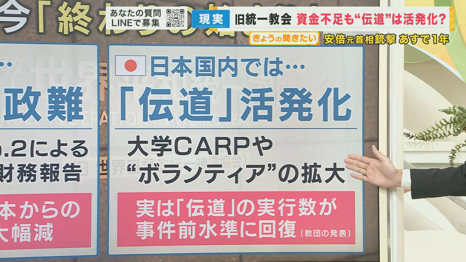 一方で、日本国内では伝道が活発化していて、協会関連の学生団体「CARP」や“ボランティア”をうたった勧誘が拡大していて、事件前の水準にまで回復しているということです。