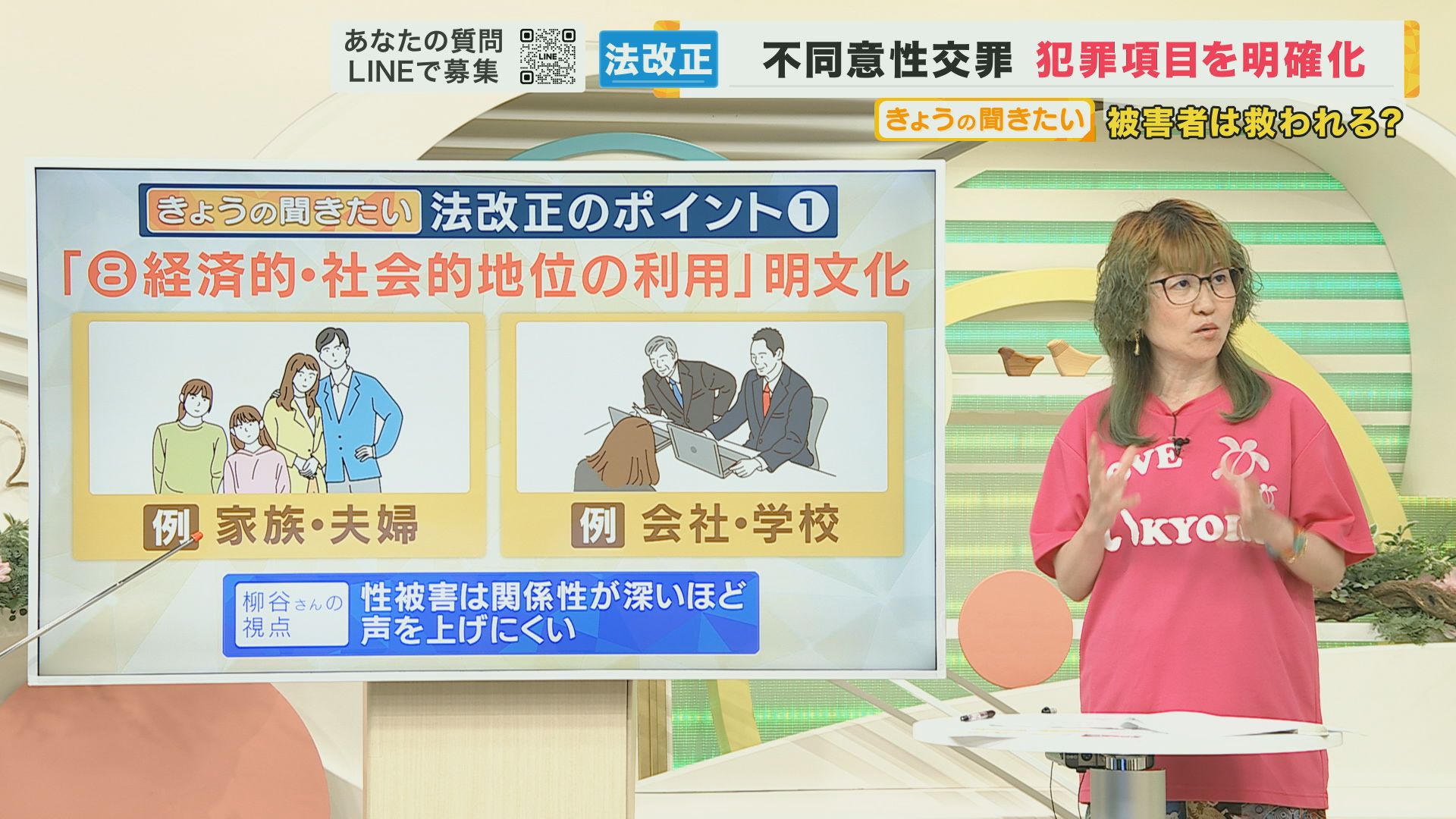 ポイントの1つ目、「経済的・社会的地位の利用」が明文化された点です。家族や夫婦、会社や学校といった場所で関係性が深いほど、性被害の声を上げにくい実情があります。だから明文化に意義があるということです。