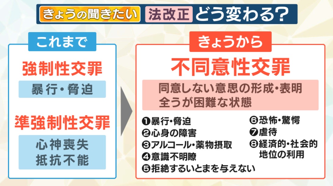 とにかく同意が必要 “イエス以外はすべてNO!”という認識を 性犯罪をめぐる法律が改正「不同意性交罪」が施行 "同意ない"具体例8つが提示 「経済的・社会的地位の利用」の明文化がポイント 2023年07月13日