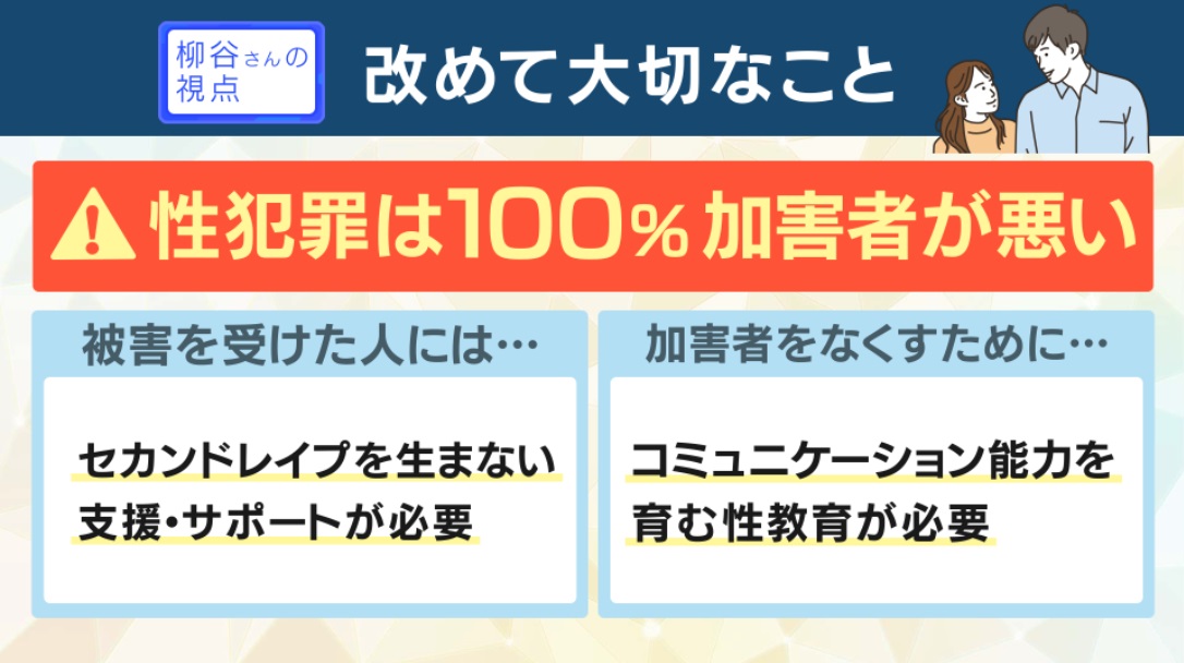 「例え酔っぱらって服を着ていない状態で寝転がっていても、毛布をかけて立ち去るっていう選択肢があるわけです。人権の感覚を持つべきで、子供の頃から誰もが安全に自由に生きる権利がある。 だから安心安全を奪ったのであれば人権侵害だよと、子供の時から守られる体験が必要になります。とにかく相手に“お伺い”して、『イヤだ』を尊重できる人間関係を築けないといけません。あと性教育は非常に大事です」