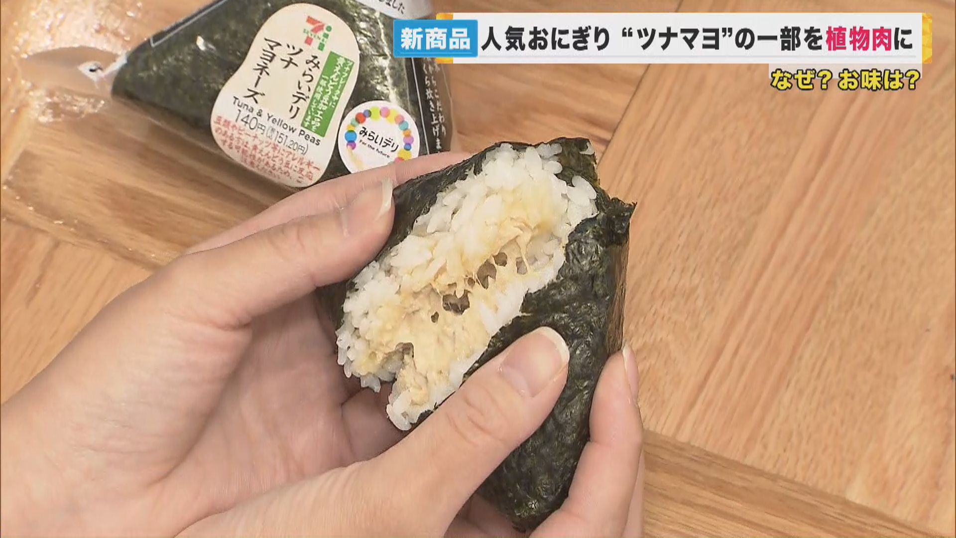 コンビニエンスストアの棚に並べられたツナマヨおにぎり。 実はエンドウ豆を加工した植物肉を原材料の一部に使った新たな「ツナマヨおにぎり」なんです。
