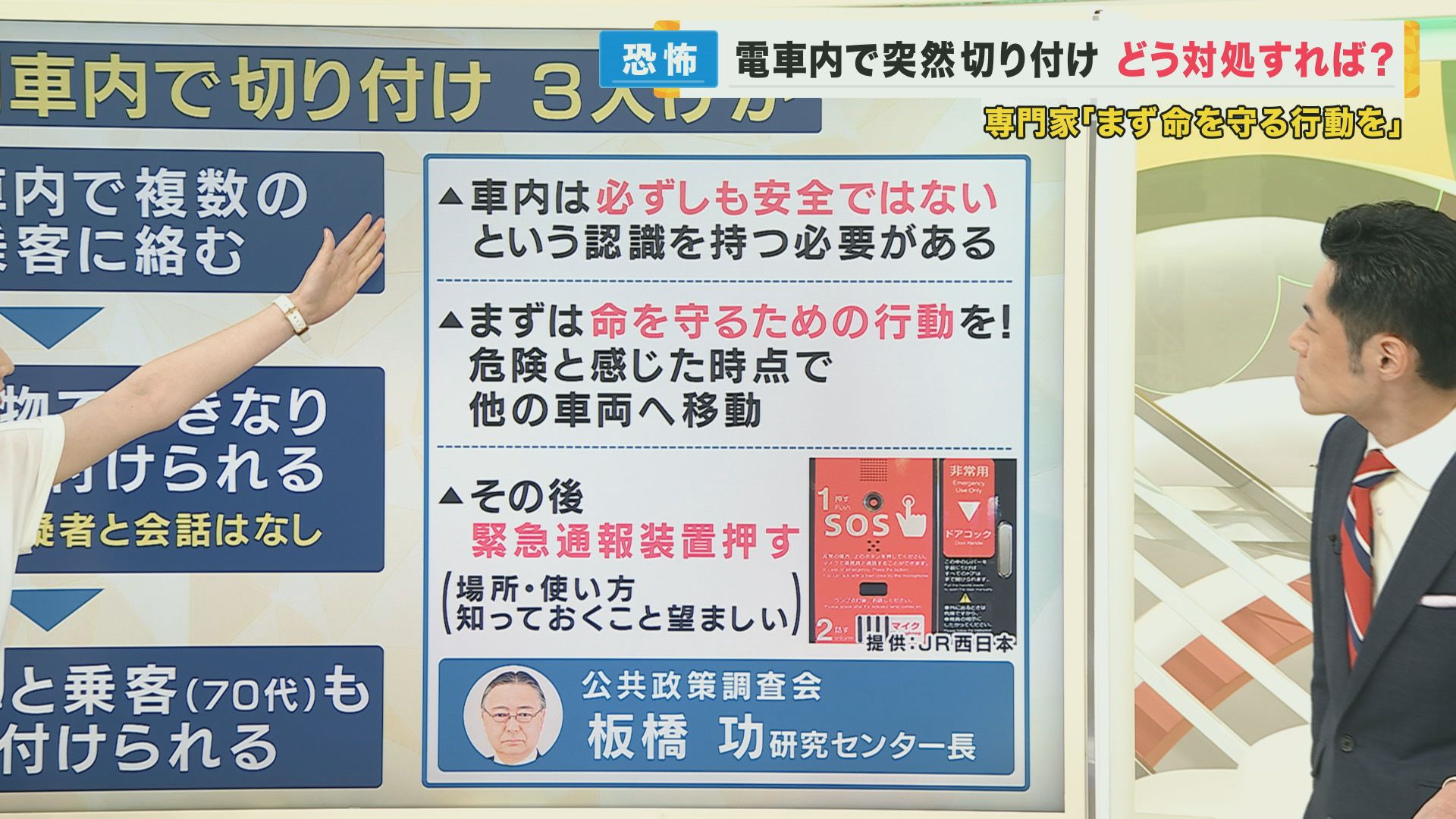 板橋研究センター長によると、容疑者が他の乗客に絡み始めた時点で危険と感じたなら、緊急通報装置を躊躇せず押す対応も選択肢としてあったのではないかと指摘しています。