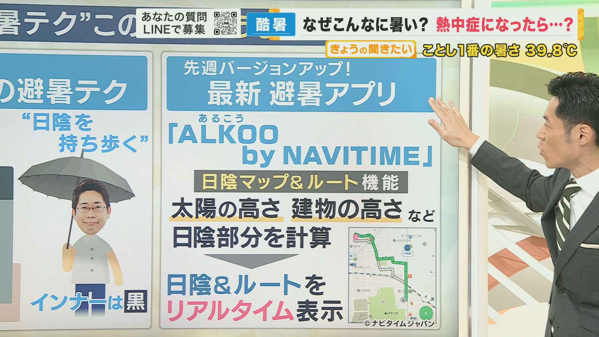 「ALKOO by NAVITIME」というアプリで、日陰マップ&ルート機能があって、太陽の高さや建物の高さなどから日陰部分を計算し、地図上に日陰になるルートをリアルタイム表示してくれます。こういったアプリも使って対策していただければと思います。