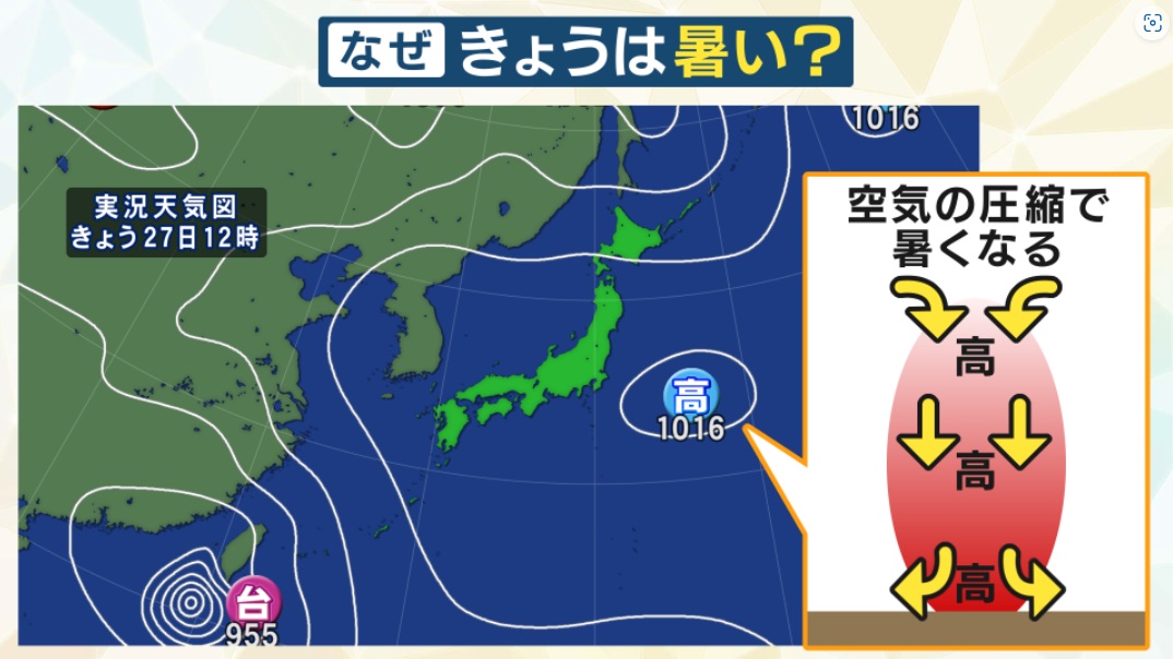 「なんでこんなに暑いのか、一言で言って“真夏”だからです。27日は真夏の中でも特に暑くなりやすい条件が重なりました。27日正午の天気図ですが、関東地方の横に高気圧マークがあります。これは夏になるとよく聞く“太平洋高気圧”です。今、太平洋高気圧の中心が本州のすぐ近くにあります。高気圧の中心がほぼ真上やすぐ近くにある時はそれだけで熱くなりやすいです。 断面をみると、太平洋高気圧は非常に背が高く、高さ1万メートルぐらいあります。高気圧は下降気流といって、上から下に風が吹いています。背が高い高気圧だとすごい高いところからグーッと風が吹き降りてきます。空気は圧縮すると暑くなる性質がありますので、ただでさえ暑い空気がさらに暑くなって、特に気温が高くなりやすい状況になっています」