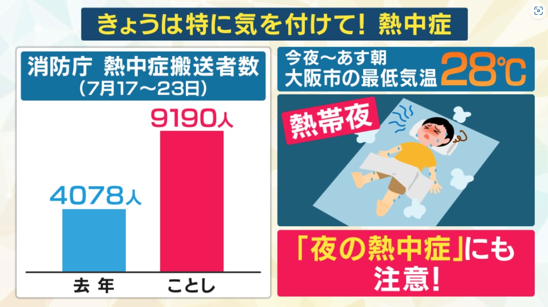 「熱中症は夜も気を付けてください。昼間のイメージがあるかもしれませんが、夜家に帰ってから調子が悪くなることもあります。27日夜から28日朝にかけて、大阪の最低気温は28度の予想です。25度以上を熱帯夜と言いますが、それより3度も高いです。夜の間も熱中症になる可能性がありますから くれぐれも用心してください。
