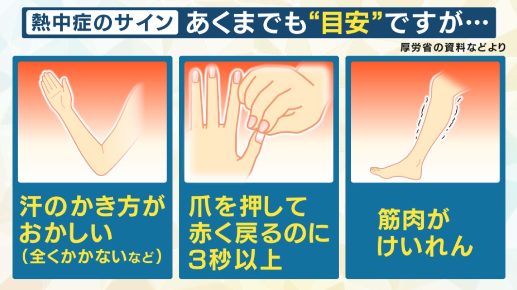 「あくまでも目安です。汗のかき方がおかしいというのは、暑かったら汗をかくはずなんですが、全くかいてなくて、皮膚が乾いて温度だけ高いときは、体の中に水分がない状況になっていることがあります。一方で普段よりも汗をかいていて、意識もはっきりしてない状況になってる時にも熱中症になってる可能性が高いです。いつもと違うということを見てください。 指の爪を押したとき、なかなか赤く戻らないことも目安だと言われています。 あと、ふくらはぎだったり、腕だったり筋肉がけいれんしている時は、やはり熱中症になっている可能性が高いというわけなんですね」