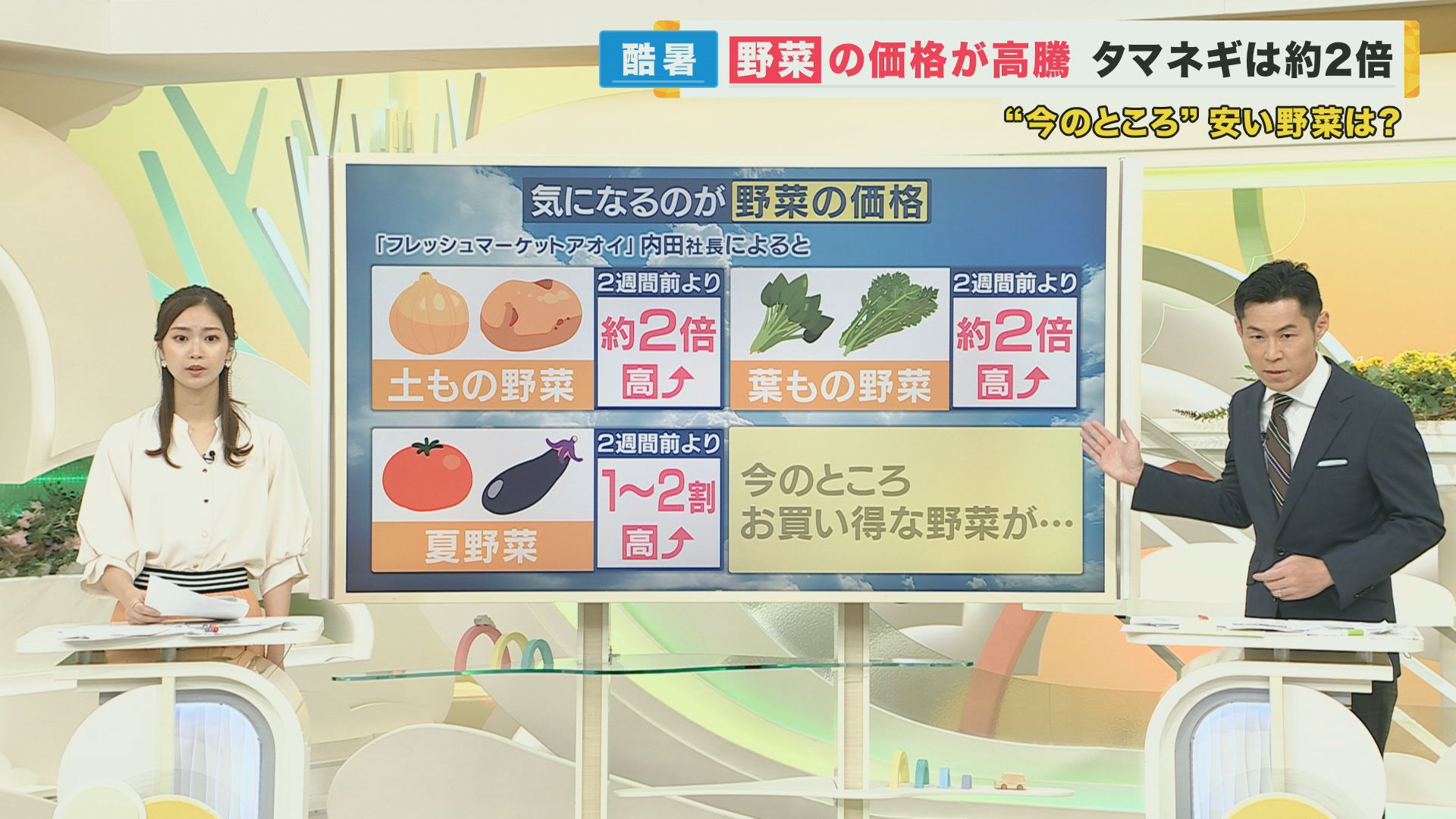 また、ほうれん草や水菜などの葉物野菜も2週間前と比べて約2倍。さらにトマトやナスといった夏野菜も2週間前と比べて、1割~2割ほど高騰してしまっているということです。
