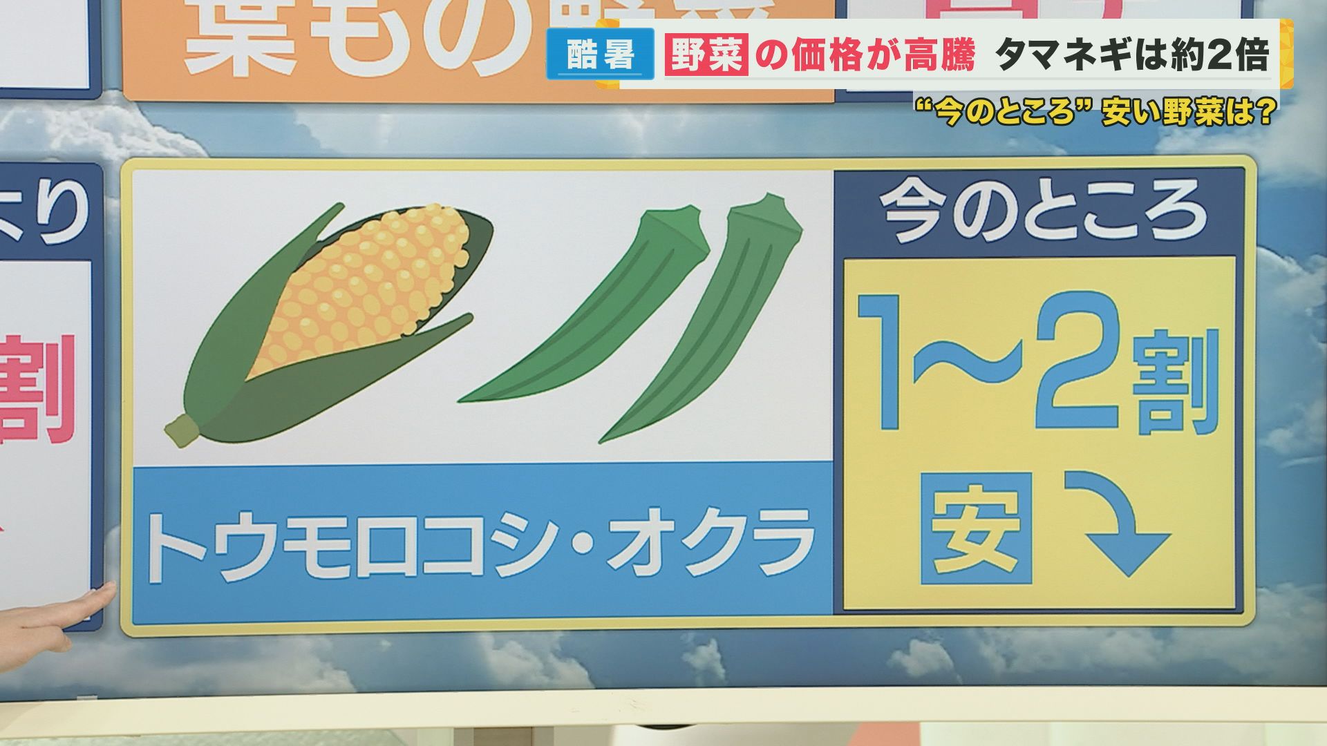 軒並み値上がりしてるという状況なんですが、お買い得な野菜もあります。夏野菜のトウモロコシやオクラは今のところ1割~2割安いということです。ただ”今のところ安い”だけで今後のことは分かりません。