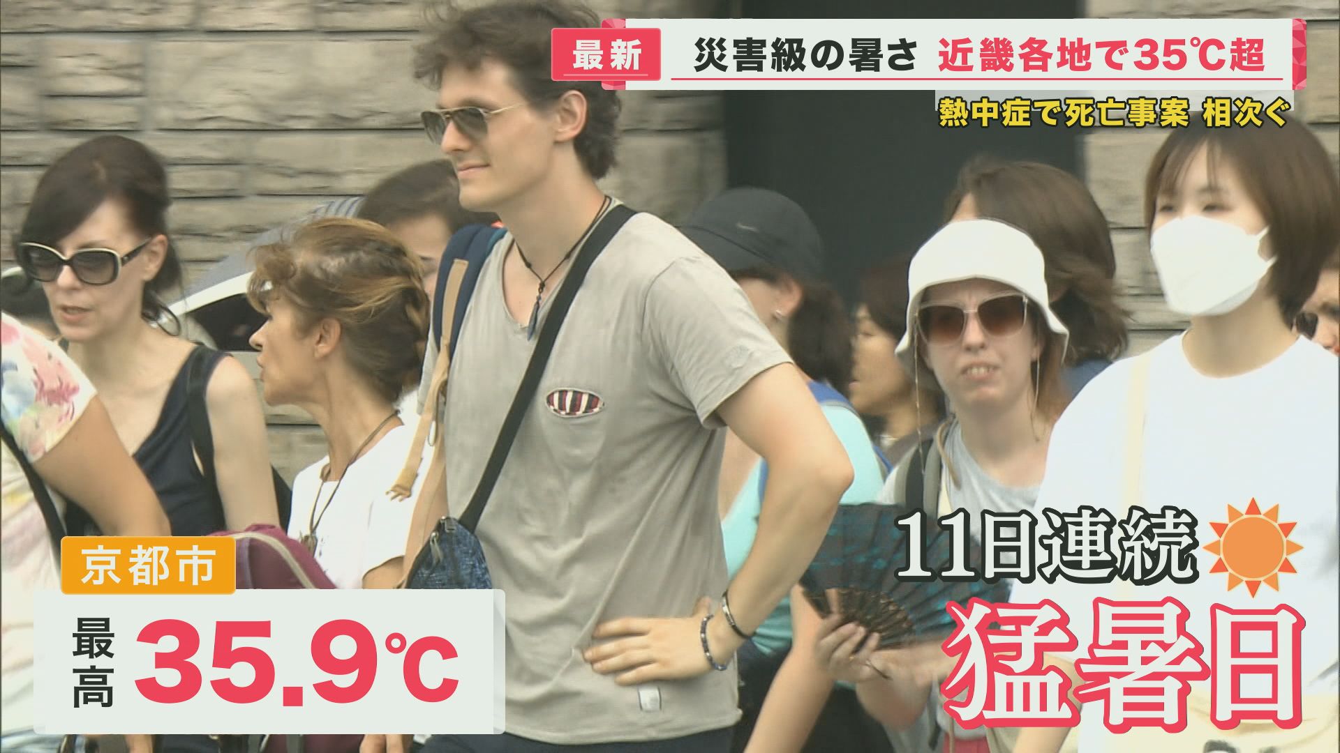 京都市も暑くなり、最高気温35.9度。なんと11日連続の猛暑日となりました。行き交う人たちは日傘や扇風機などを手に暑さをしのぎますが、汗びっしょりです。
