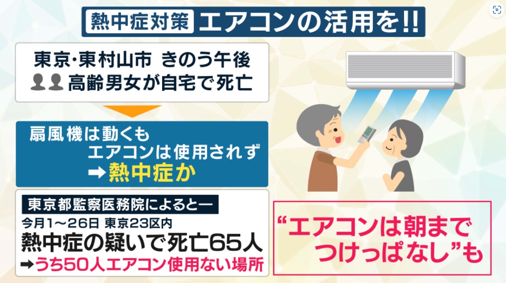 他にも、東京都東村山市の住宅では7月30日、70代くらいの男女が死亡しているのが見つかりました。扇風機は動いていましたがエアコンは使われておらず、熱中症の可能性もあります。東村山市では29日にも扇風機だけが動いていた部屋で高齢の夫婦が亡くなっています。東京都監察医務院によると、7月1日から26日までに東京23区内で熱中症の疑いで死亡した人は65人で、このうち50人が、エアコンが使用されていない場所で亡くなっていました。