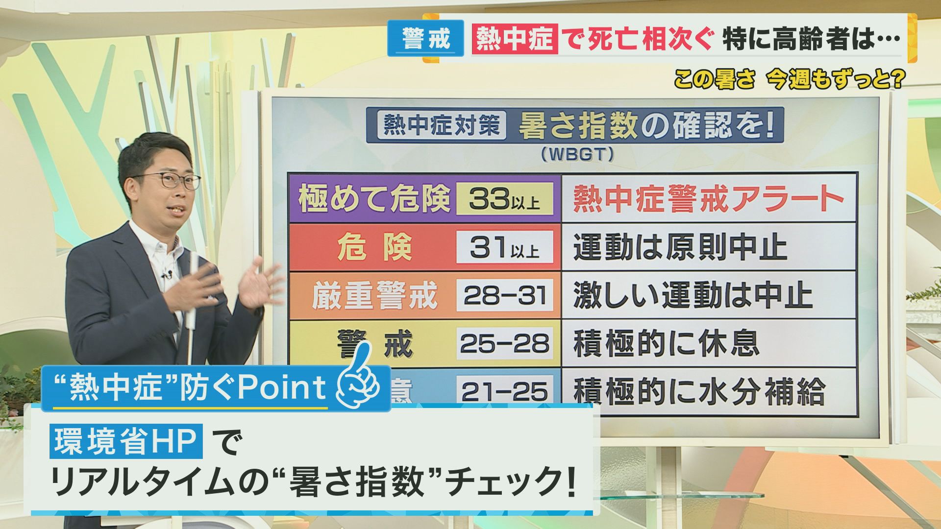 はい、「暑さ指数」もうまく使っていただきたいです。最高気温はよく天気予報でお伝えしますが、気温だけではなく湿気が多くてジメジメしている時の方が熱中症になりやすいです。あと日差しが出ていたり、建物の壁から熱がきたりするというものも加味して、どれぐらい熱中症の危険性があるかを表したのが「暑さ指数」で、その数字が33以上になるとわれわれもお伝えしている「熱中症警戒 アラート」となります。実はその前から「危険」とか「厳重警戒」という段階があって、こういう対応をしてくださいというのが詳しく決まっています。テレビなどで「明日危ないよ」という話を聞いたら、例えば高齢者のご家族がいる方、高齢者施設の方、学校関係の方、こういった方はぜひ自宅の近くの「暑さ指数」がどうなっているか調べてもらえればと思います。環境省のホームページで詳しくリアルタイムで見られます。自分の事と思っていただきたいと思います。
