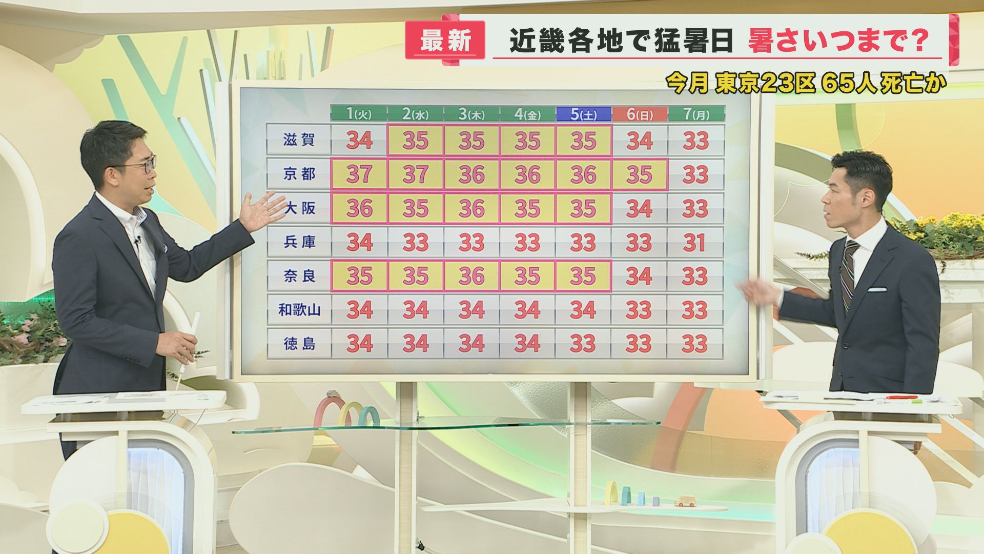 7月31日、近畿各地の最高気温ですが、大阪が35度ちょうどで猛暑日になりました。各地で気温が35度以上になったところが多く、やっぱり『暑さは災害』と思っていただきたいです。前週の38度、39度と比べれば少しは下がっていますが、命に関わるような暑さになっています。