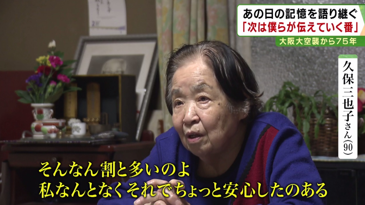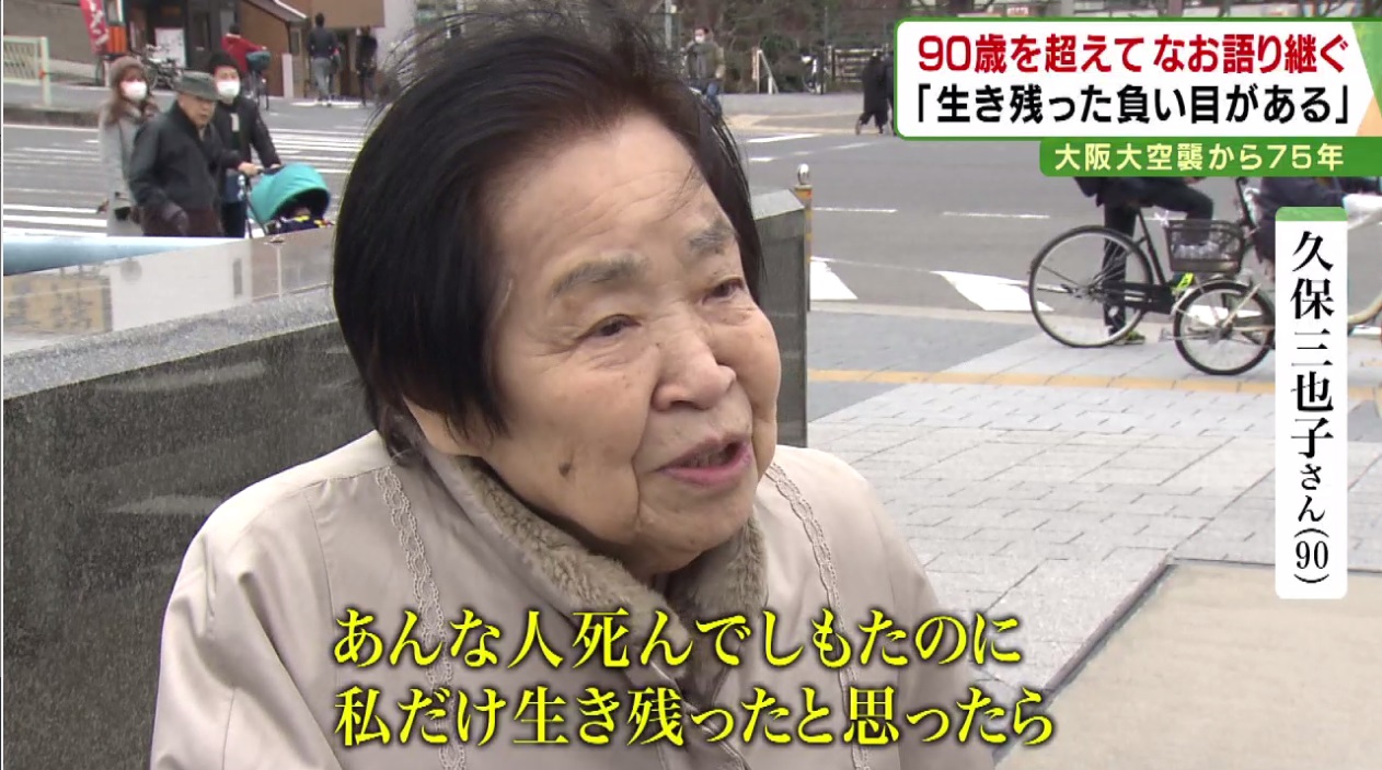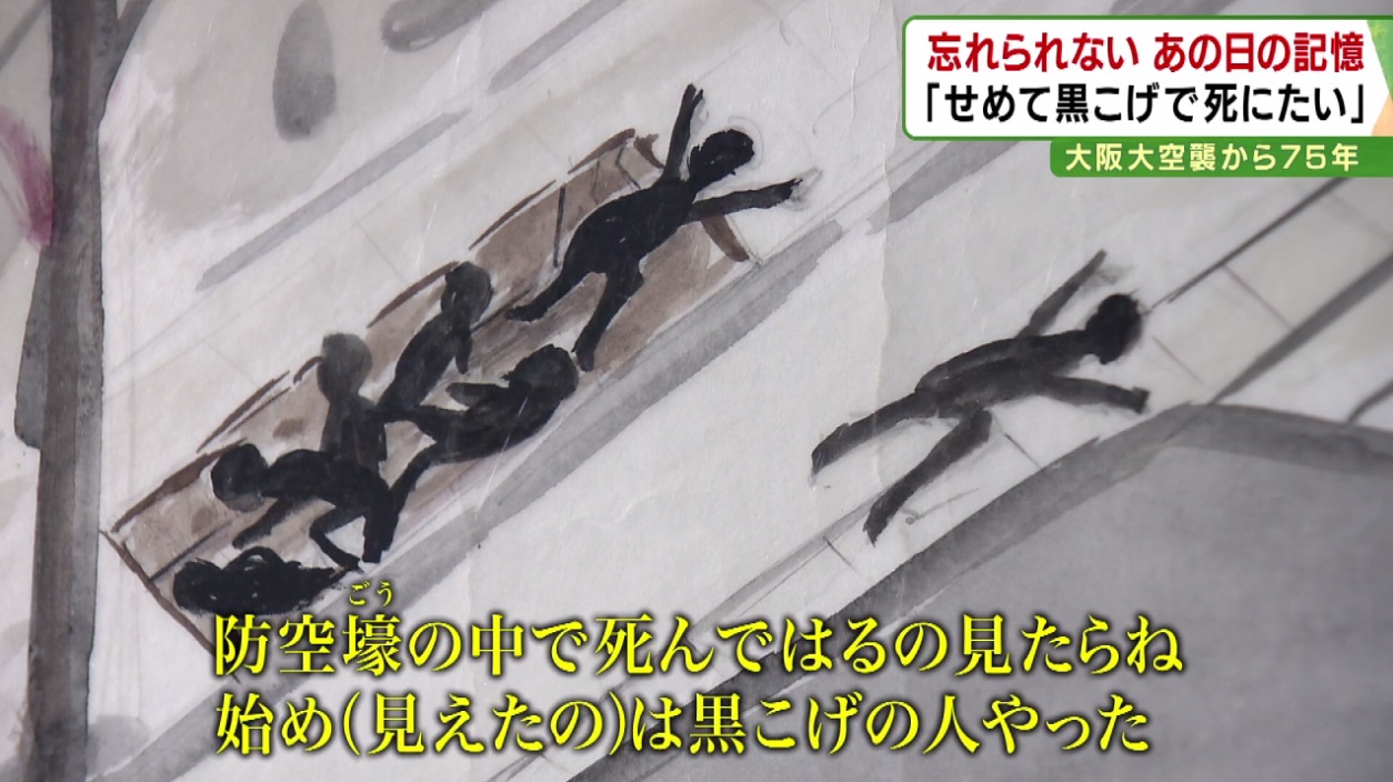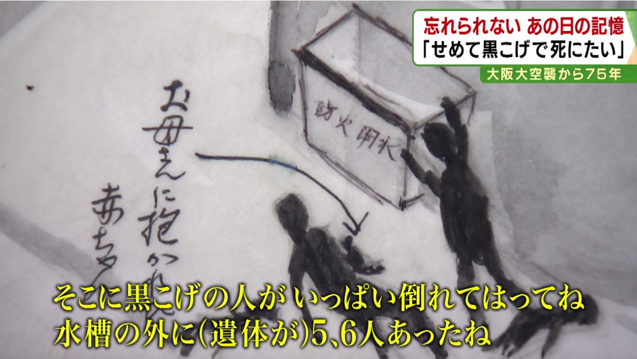 「(当時の大阪市)交通局の庁舎まで行ったのは、水があると思ってね。大きな防火用水。せっかく来たのに、防火用水の水は何にも(残っていない)。そこに黒焦げの人がいっぱい倒れてはってね。水槽の外に(遺体が)5、6人あったね。1人はお母さんやと思う。この人、子供さんを…小さい骨を抱えてはったから」