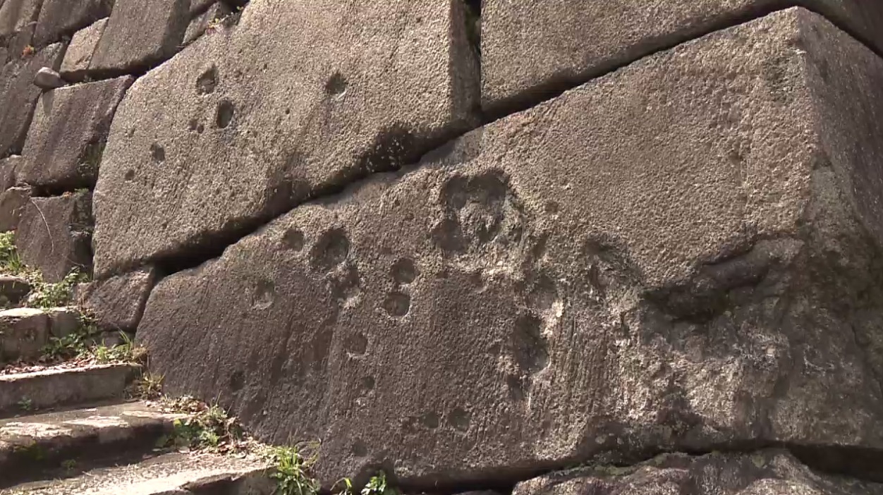 ・大阪城の機銃掃射跡:日本軍の司令部があった大阪城の石垣には、空襲による銃弾の跡が残っています。