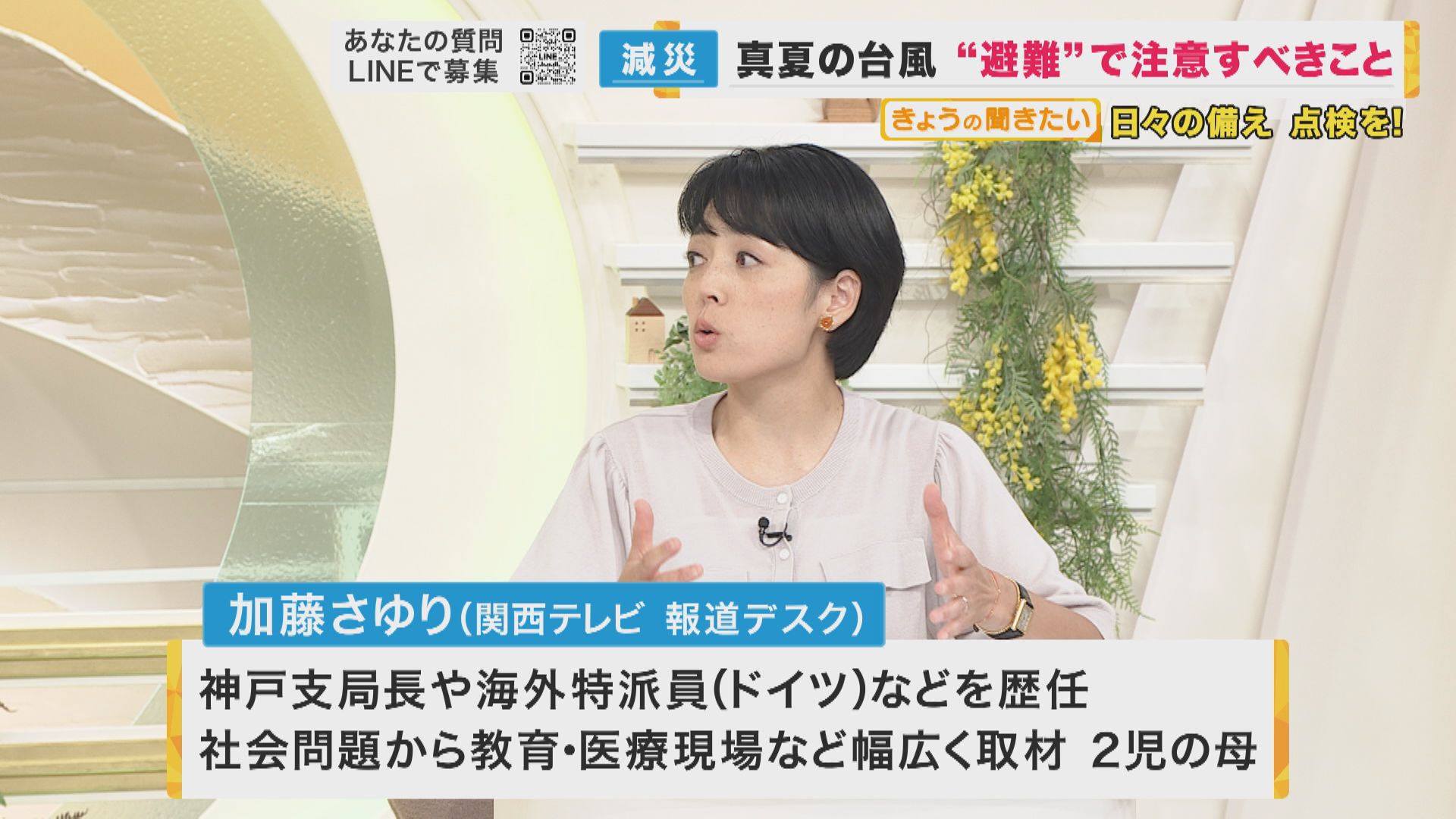 「普段、災害が起きていない時に見ておくのも、とても大事ですし、あとは避難所に逃げるだけが避難ではなくて、例えば、知り合いの家とか家族の家とか、そこに避難するというのも一つの選択肢なので、いくつもどこに逃げようかという選択肢を作っておくことは大切ですね」 そういう備えをしっかりしていかなくてはいけないんですが、私たちができる備えというのがこちらです。