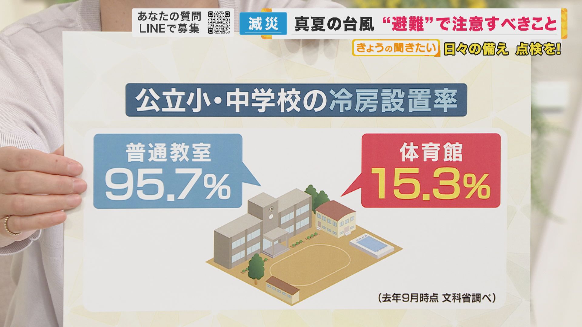 「皆さん、公立の小中学校が避難先というケースが多いと思うんですよね。文科省の去年9月時点の数字で、エアコンは普通の教室だと95%普及してるんですけど、体育館はまだ15.3%しか設置できてないんですよね。少しずつ増えてはいるんですが、設置費用 はかなりかかりますよね。体育館 広いですからね。なので、費用も国が補助しますとは なってるんですけど、3分の1なんですよ。残りは自治体がどれだけ用意できるかっていうところで差が出てきてるのかもしれないですね」