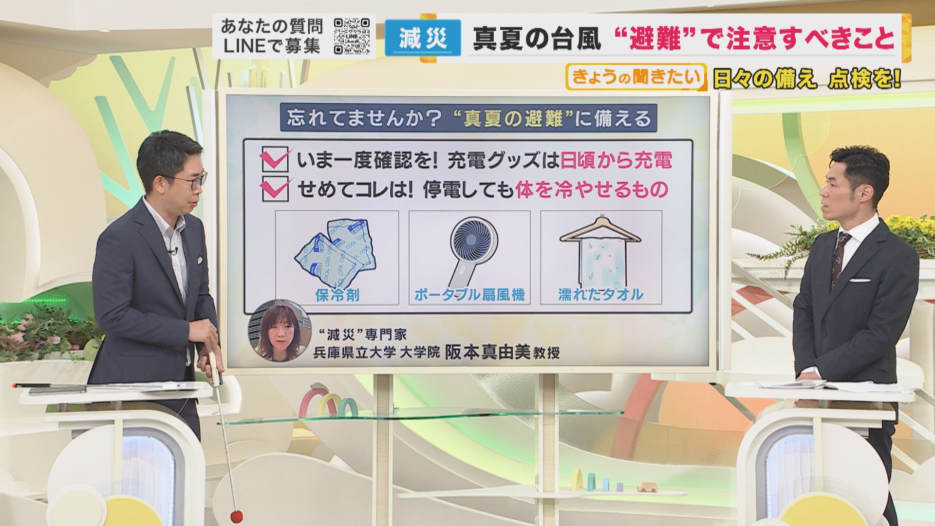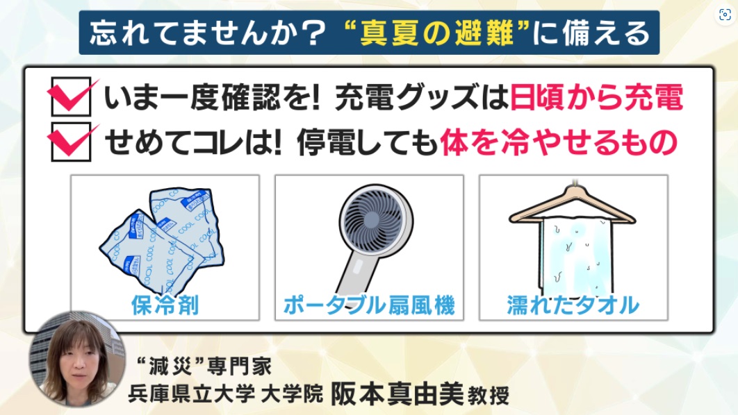減災の専門家、兵庫県立大学大学院の阪本教授によると… ・充電グッズは日頃から充電 ・停電しても体を冷やせるもの 例えば、保冷剤であったり、ポータブル・携帯で動くような扇風機であったり、濡れたタオル。こういったものが必要だということです。