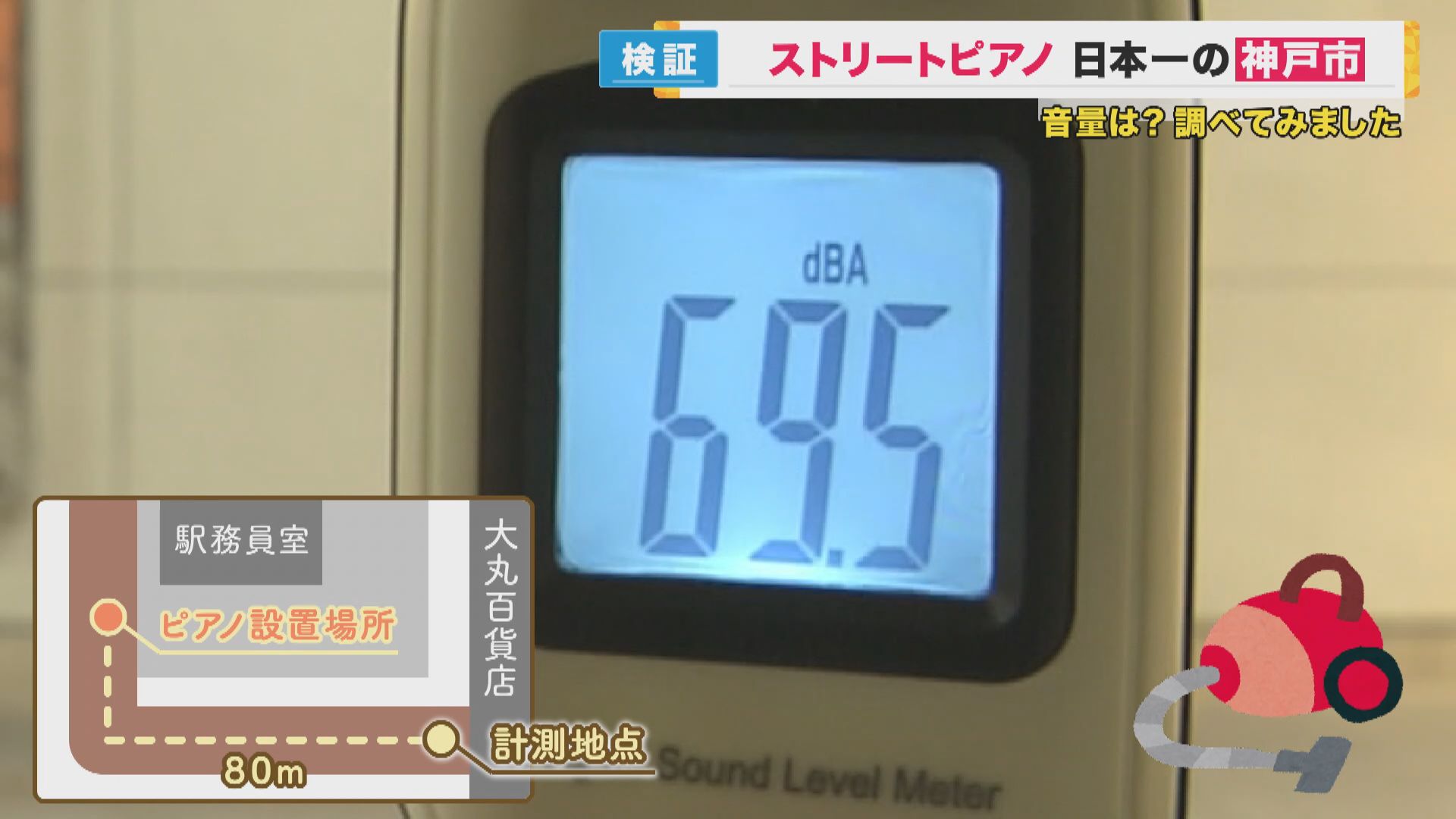 ピアノからおよそ80メートル離れた、大丸百貨店の入り口の近くでは60から70デシベルの大きさで、これはピアノを聴こうとしていなくても、掃除機と同じくらいの大きさの音が流れているということになります。