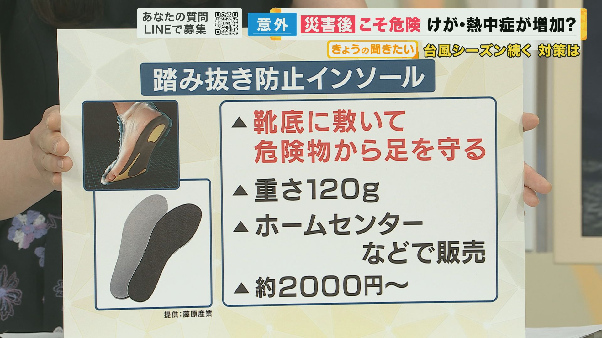 「足の方ですが、『踏み抜き防止インソール』というものが販売されています。靴の中に入れておけば、くぎであったりガラス片を踏み抜くのを防止することにつながります。とがったものを踏んだとしても、ある程度貫通するのを予防することが可能になります。