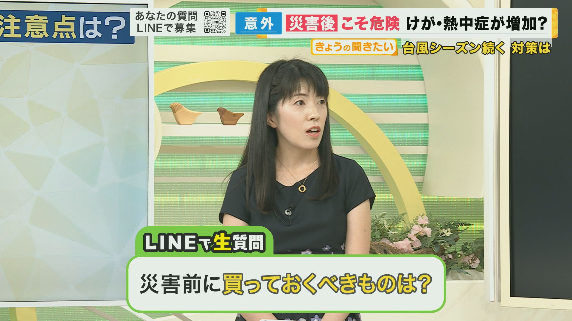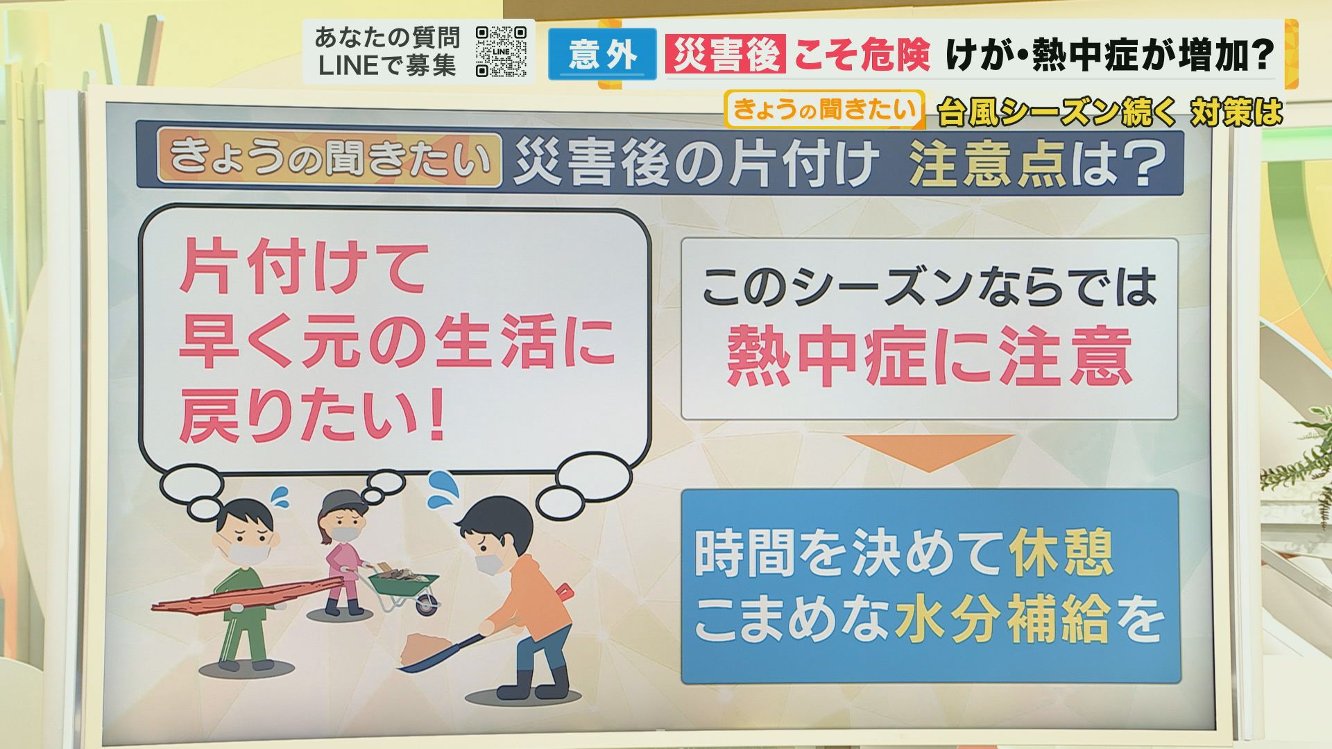 台風が過ぎ去った後に熱中症になる方やけがをする方が多いという医師の話があります。災害の後にも注意が必要です。