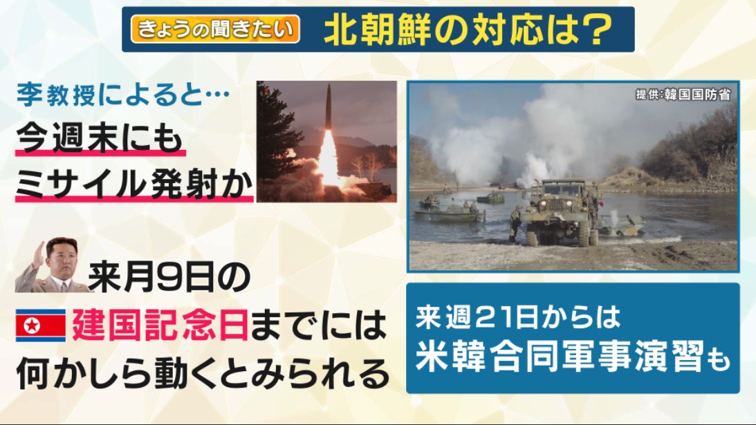 「北朝鮮はいつも米韓合同軍事演習には激しく反発します。日米間3カ国首脳会談をにらんでICBMを発射する可能性ありますが、「みんなが発射するだろう」という今のタイミングでミサイル発射しても効果は大きくありません。なので米韓合同軍事演習をにらんでやってくるでしょう。あとは建国75周年にあたる9月9日前後で、軍事偵察衛星の発射などをしてくるかもしれません」