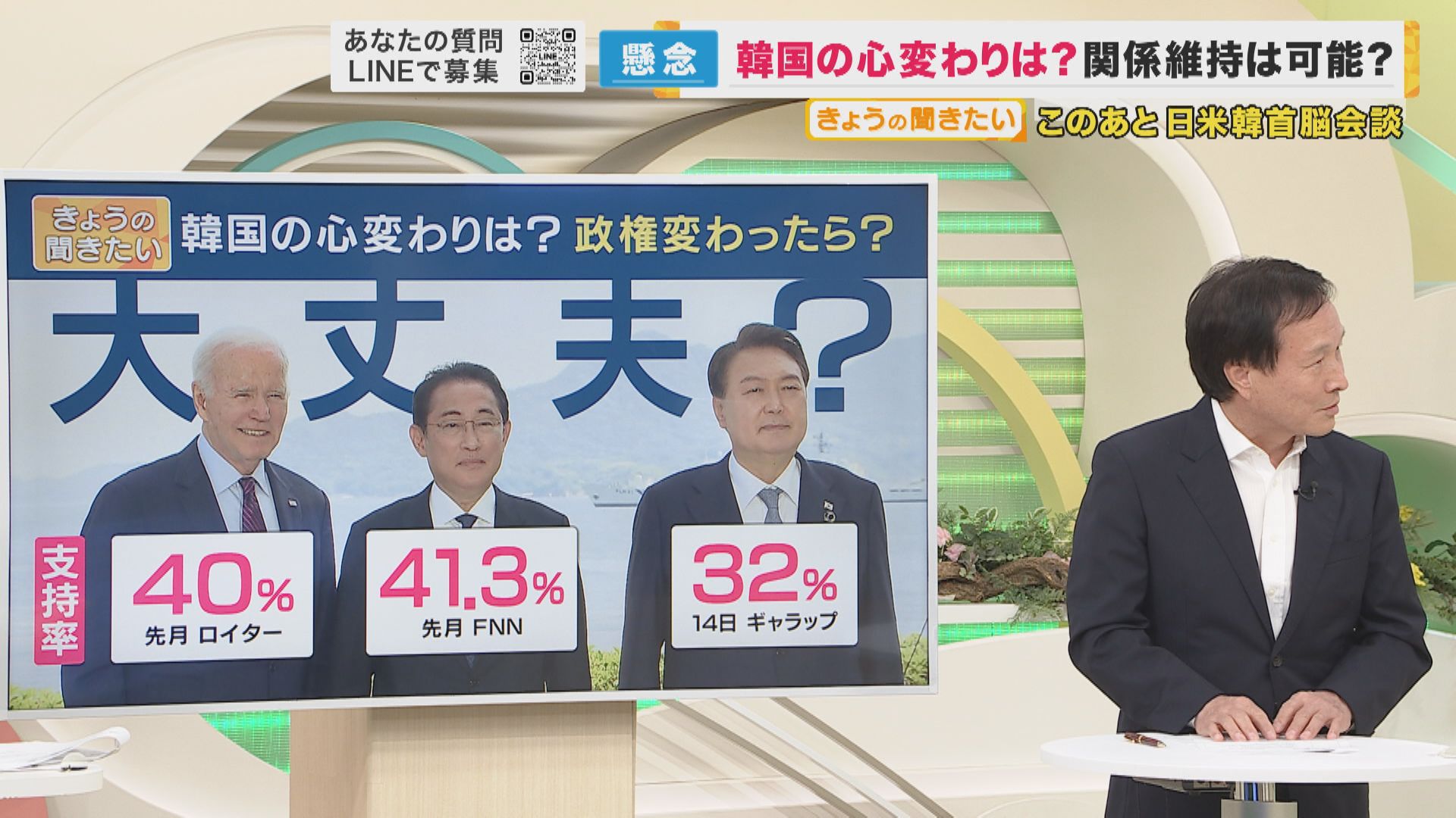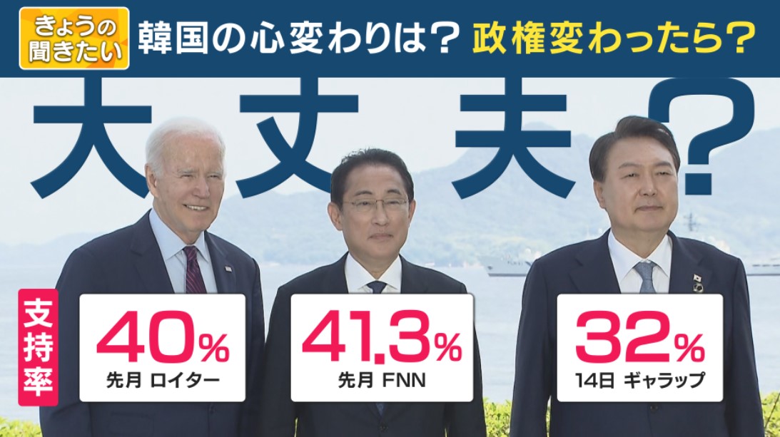 おもてなしをする気持ちがより強いというなんでしょうね。 ただ、気になるのはこの枠組みが本当に続くのかという点です。韓国の政権が変わっても大丈夫なのでしょうか。日米韓3人の首脳の最近の支持率は、バイデン大統領40%、岸田総理41.3%、尹大統領32%となっています。