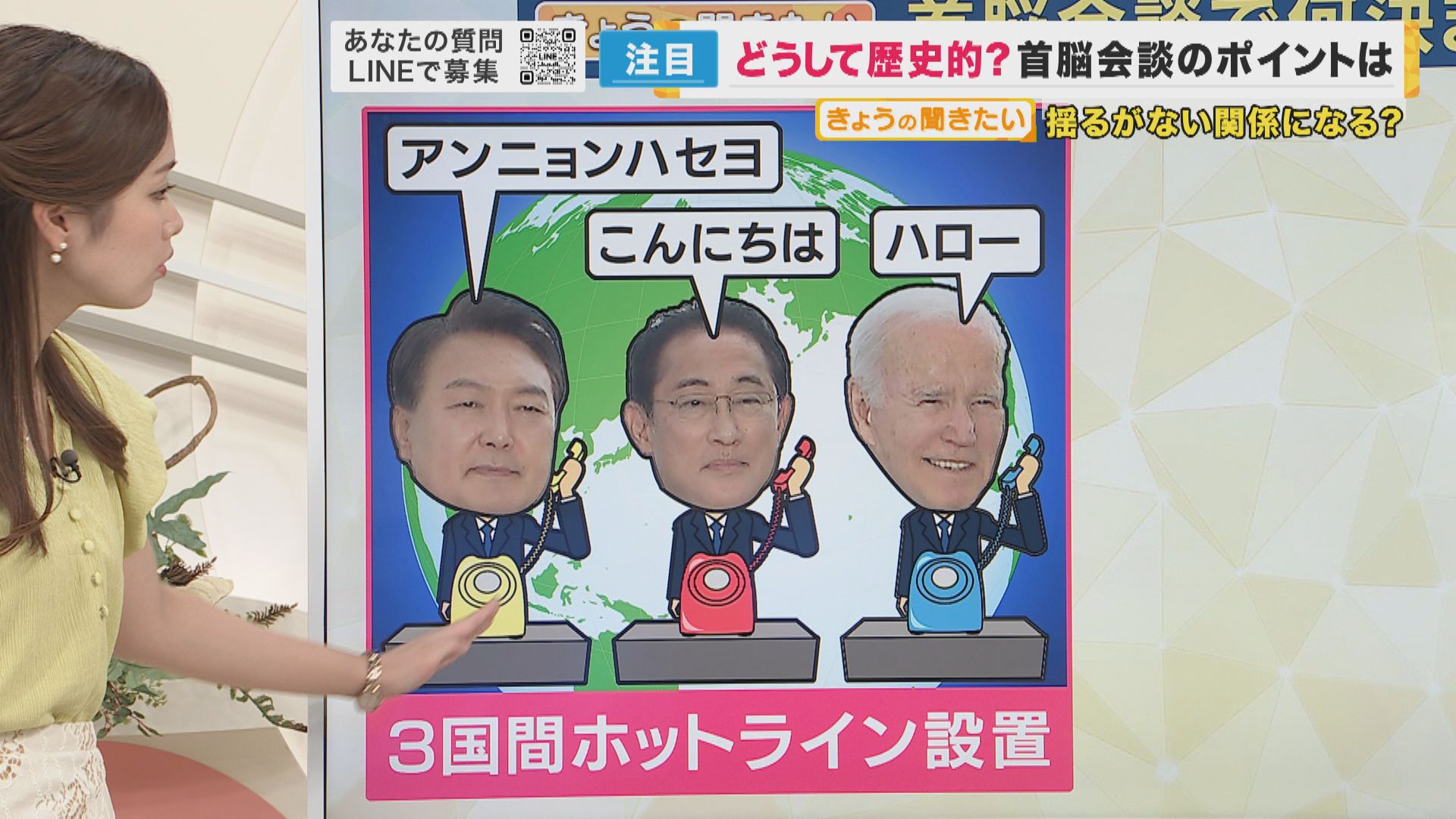 日本と韓国、そしてアメリカの3カ国による首脳会談、この会談で何が決まるか注目されているのが、緊急時に各首脳が連絡を取り合うための「3カ国間ホットライン」の設置です。