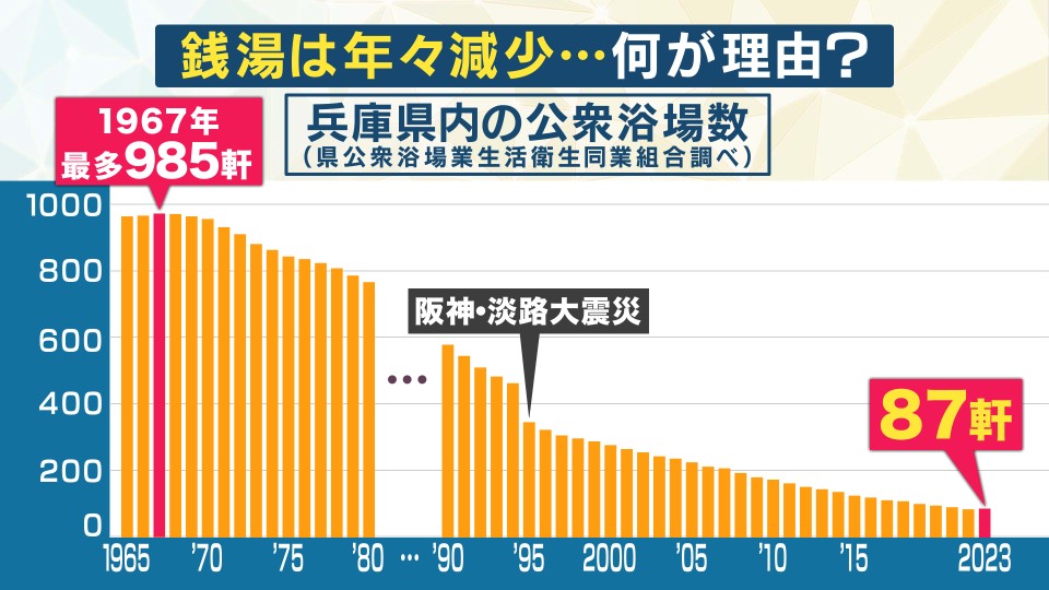 湊河湯は再建しましたが、兵庫県内の公衆浴場数は年々減少しています。1967年には最多の985軒でしたが、年々減少していき、2023年6月には、87軒にまで減ってしまっています。