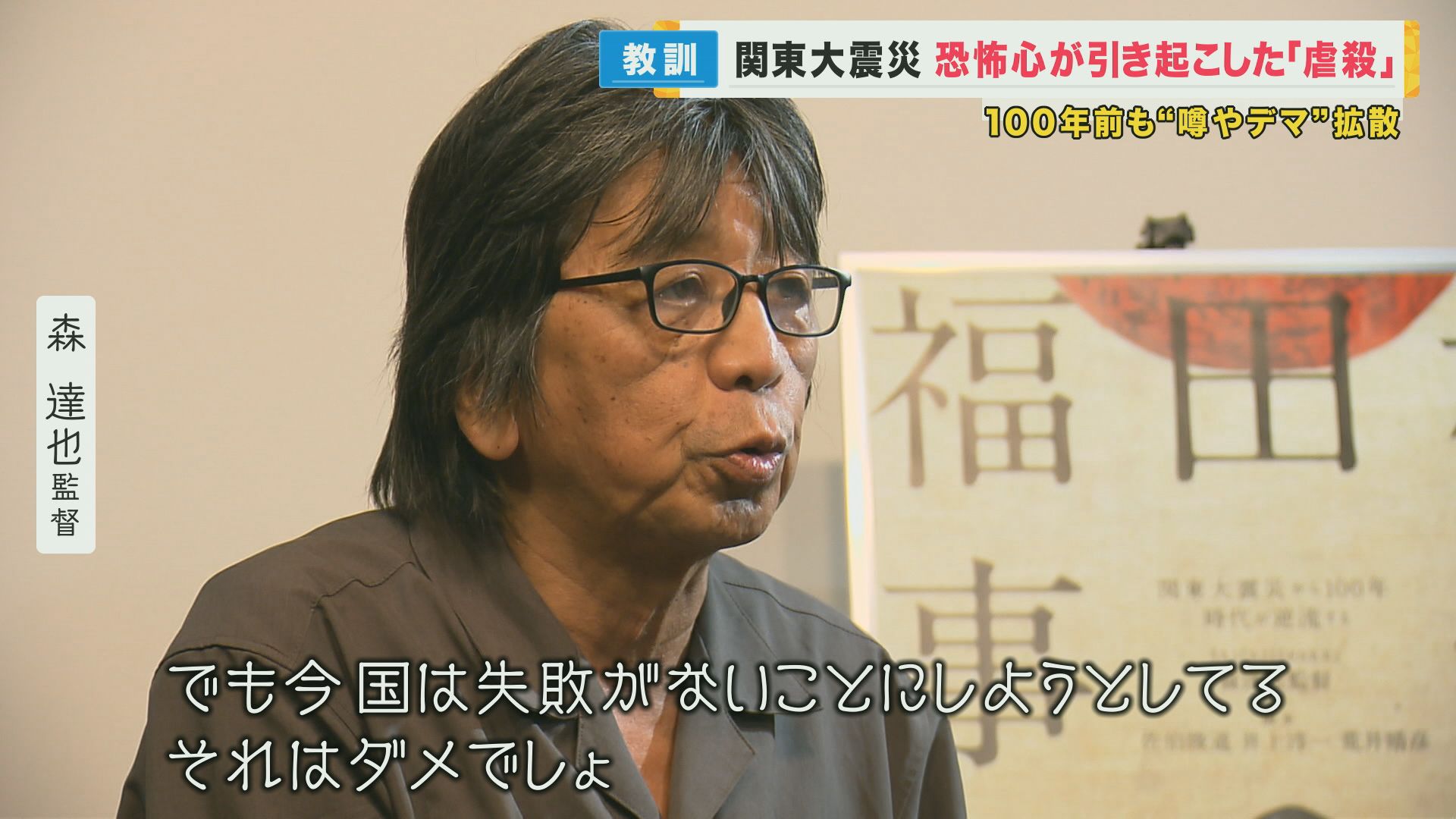 関東大震災での朝鮮人虐殺について記録が見当たらないと言う松野官房長官。昨今、この国は負の歴史から目を背ける傾向が強くなってきたと森監督は感じています。