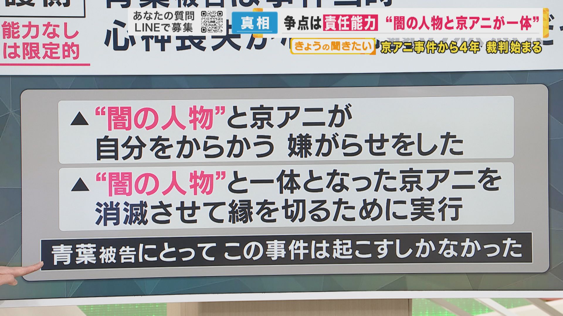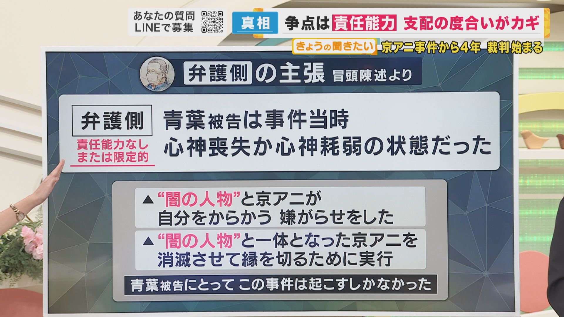 次に弁護側の主張です。 青葉被告は事件当時、心身喪失か心身公弱の状態だったとして「責任能力はない、または限定的だ」と主張しました。 その上で「“闇の人物”と京都アニメーションが、自分をからかう嫌がらせをした。“闇の人物”と一体となった京都アニメーションを消滅させて縁を切るために実行した」として青葉被告にとってこの事件は起こすしかなかったと主張しました。