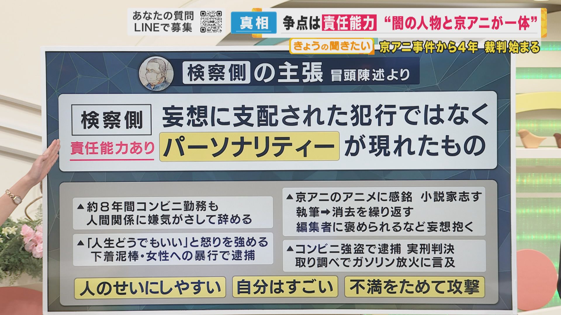 5日の裁判では、検察側・弁護側の双方が青葉被告の責任能力、そして犯行に至るまでの見立を主張しました。まず検察側から見ていきたいと思います。 検察側は「妄想に支配された犯行ではなく、パーソナリティーが現れた犯行だ」として、責任能力はあると主張しました。このパーソナリティーを説明するためにこういった過去を紹介しています。