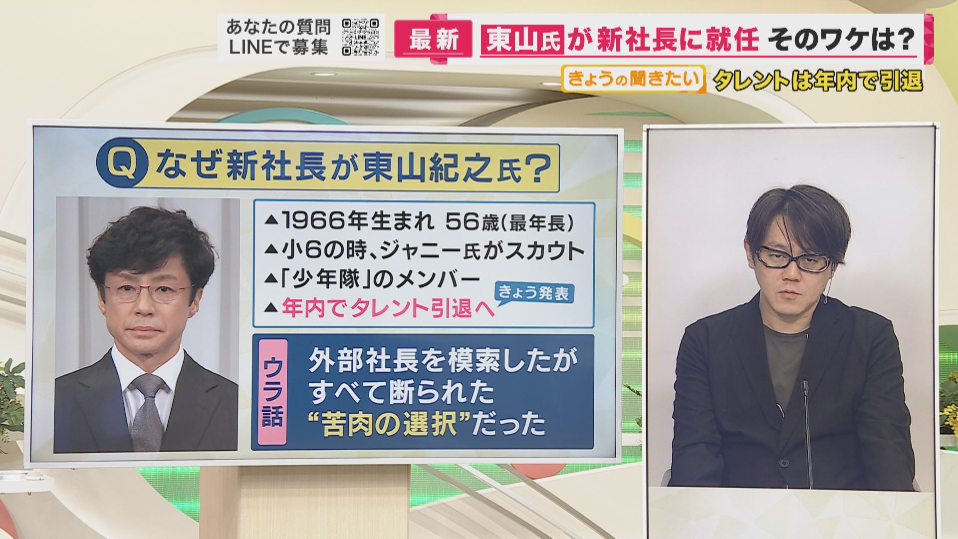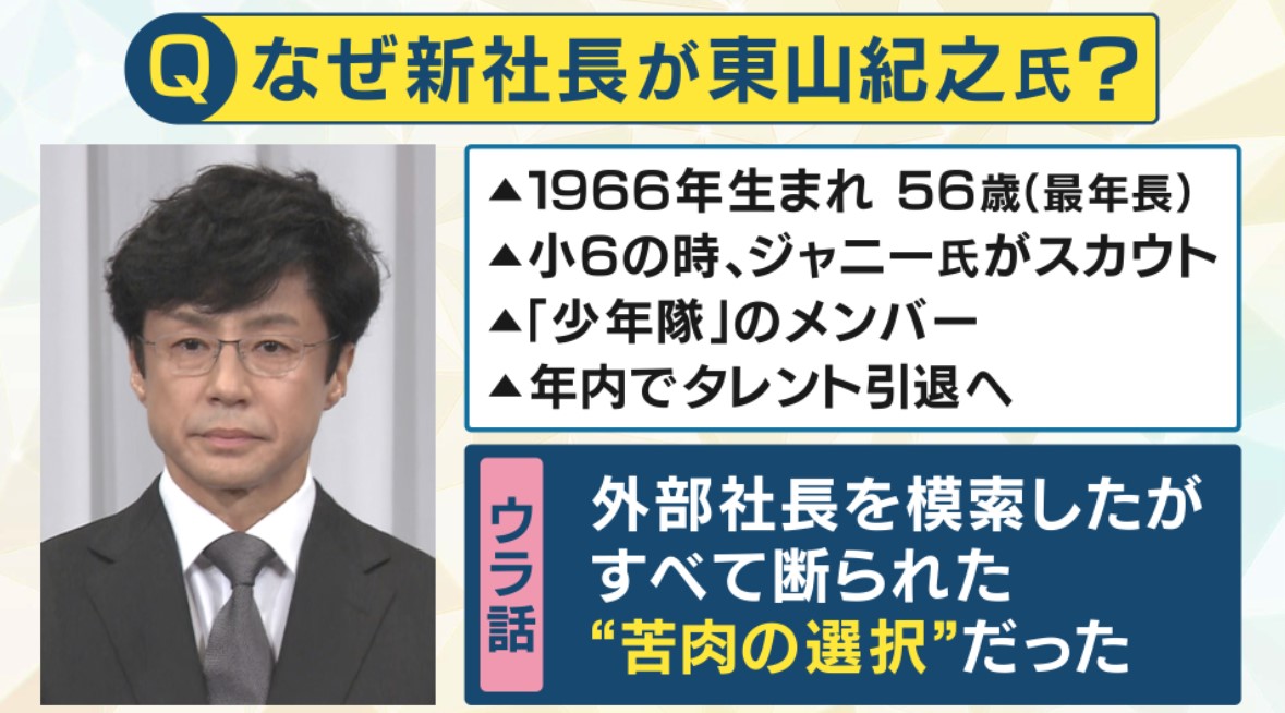 しかし今回は、複数に打診をしたけれども断られてしまったようです。会見の中で東山さんが『社長就任の話が来たのが8月上旬』とおっしゃっていました、つまり1カ月前のことです。 6月ぐらいから、こういう方向の筋道が見えていたとしたならば、やはり2カ月間ぐらい代わりの社長を探してきたけど見つからなかったようです。今回の東山新社長就任もいろいろ断られた上で、タレントからの昇格という本当に苦渋の選択だったと思います」