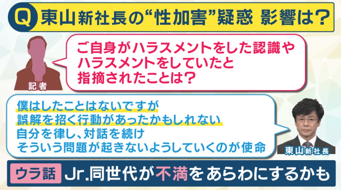 7日の会見では新社長によるハラスメント疑惑も浮上しました。 記者から「ご自身がハラスメントをした認識や、ハラスメントをしていたと指摘されたことはありますか」と質問されると、東山新社長は「僕は性加害をしたことはないです。誤解を招く行動があったかもしれない。思い出すことも多々ある。自身を律し、対話を続け、そういう問題が起きないようしていくのが使命」と話しました。 これに対し、松谷さんは「ジュニア時代に東山さんと同世代だった人たちが不満をあらわにするかも」と指摘されています。これはどういうことなんでしょうか?