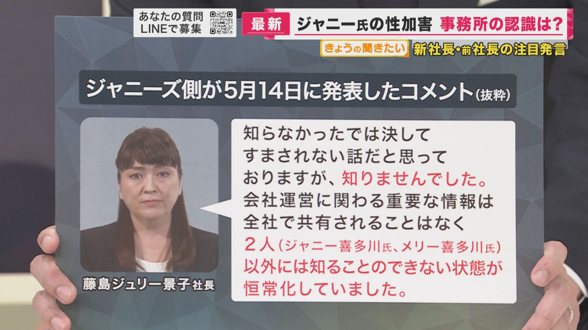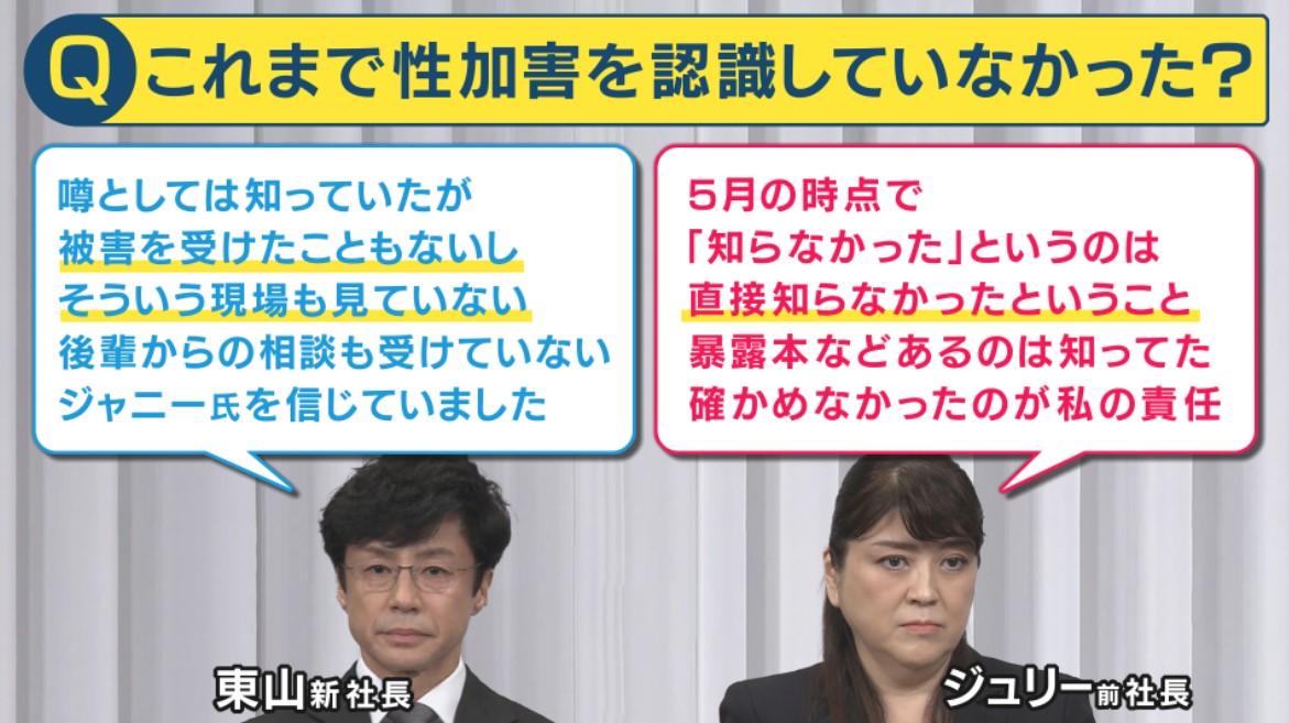 解体的な出直しとなりましたが、次に、東山新社長が会見で語った内容を中心に見ていきましょう。ジャニー元社長の性加害を知っていたのかという質問に対し、新社長の発言がコチラになります。