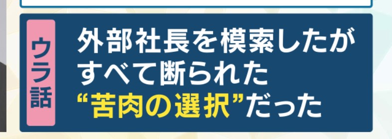 なぜ東山さんが新しい社長になることになったのか、松谷さんによりますと、その舞台ウラがこちらです。 外部社長を模索したが、すべて断られた。苦肉の選択だったということです。