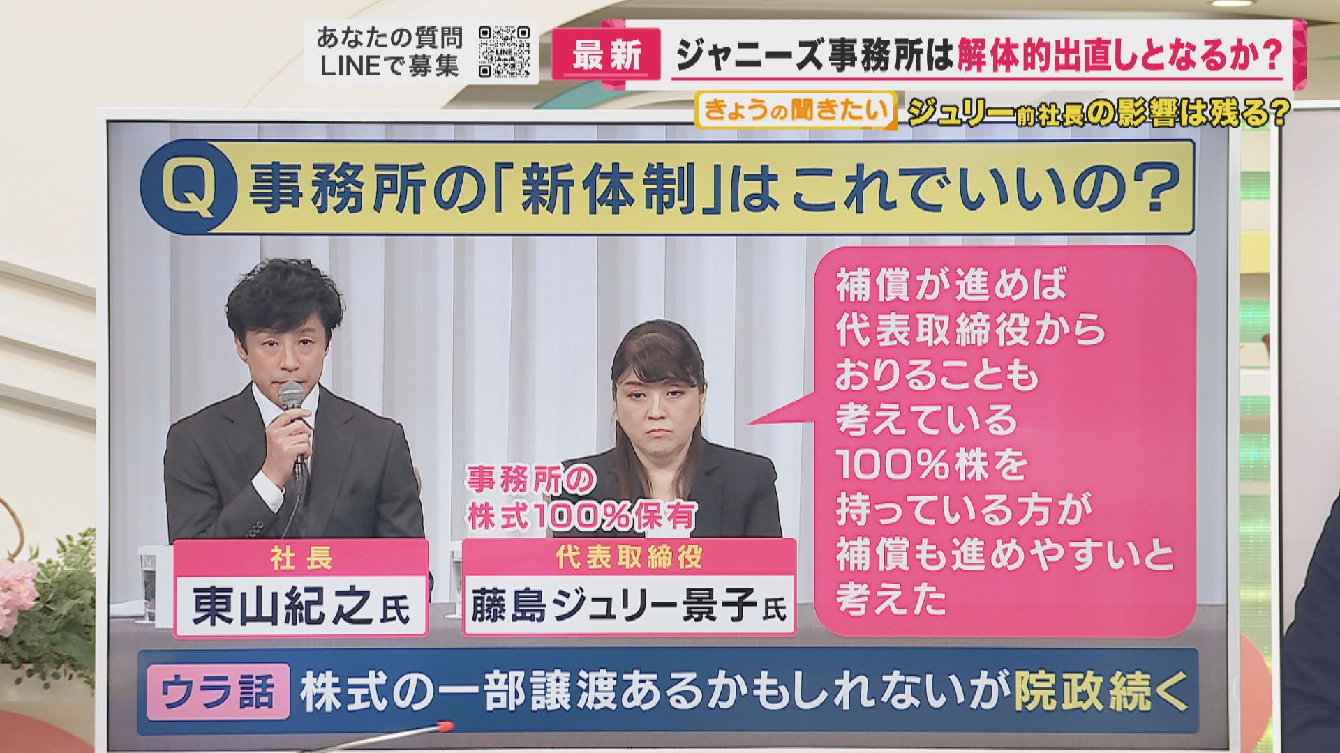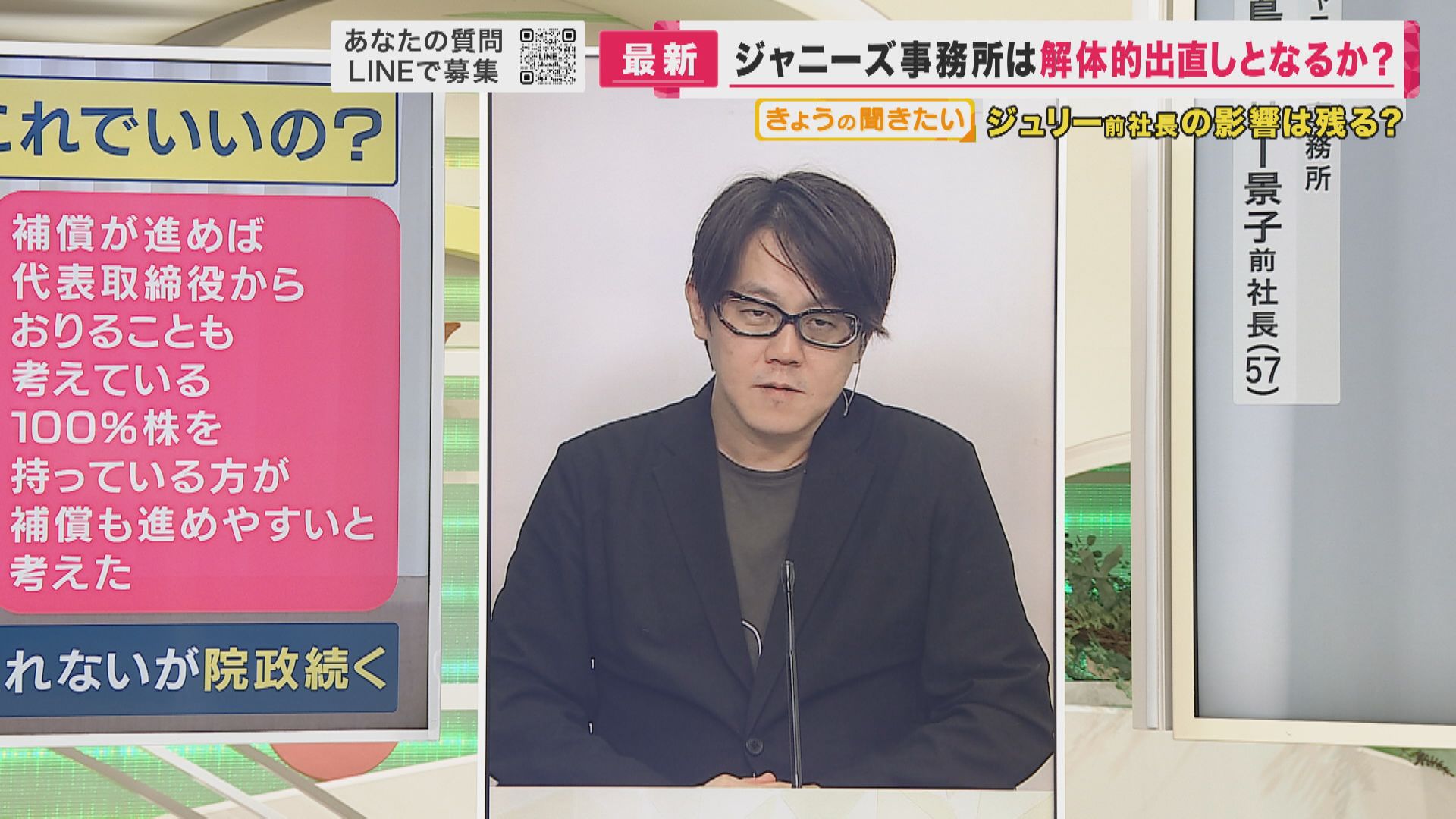 「一般論として会社は、社長のものではなく株主のものです。だから100パーセント株式を持っているということは、ジャニーズ事務所は今後も藤島ジュリー景子前社長のもので、変わらないですよね。会長に退くのではないかと私は当初見ていたのですが、ここで取締役に残って補償・交渉のみをやっていくというのは、彼女なりの真摯なスタンスを見せたのではないかと。