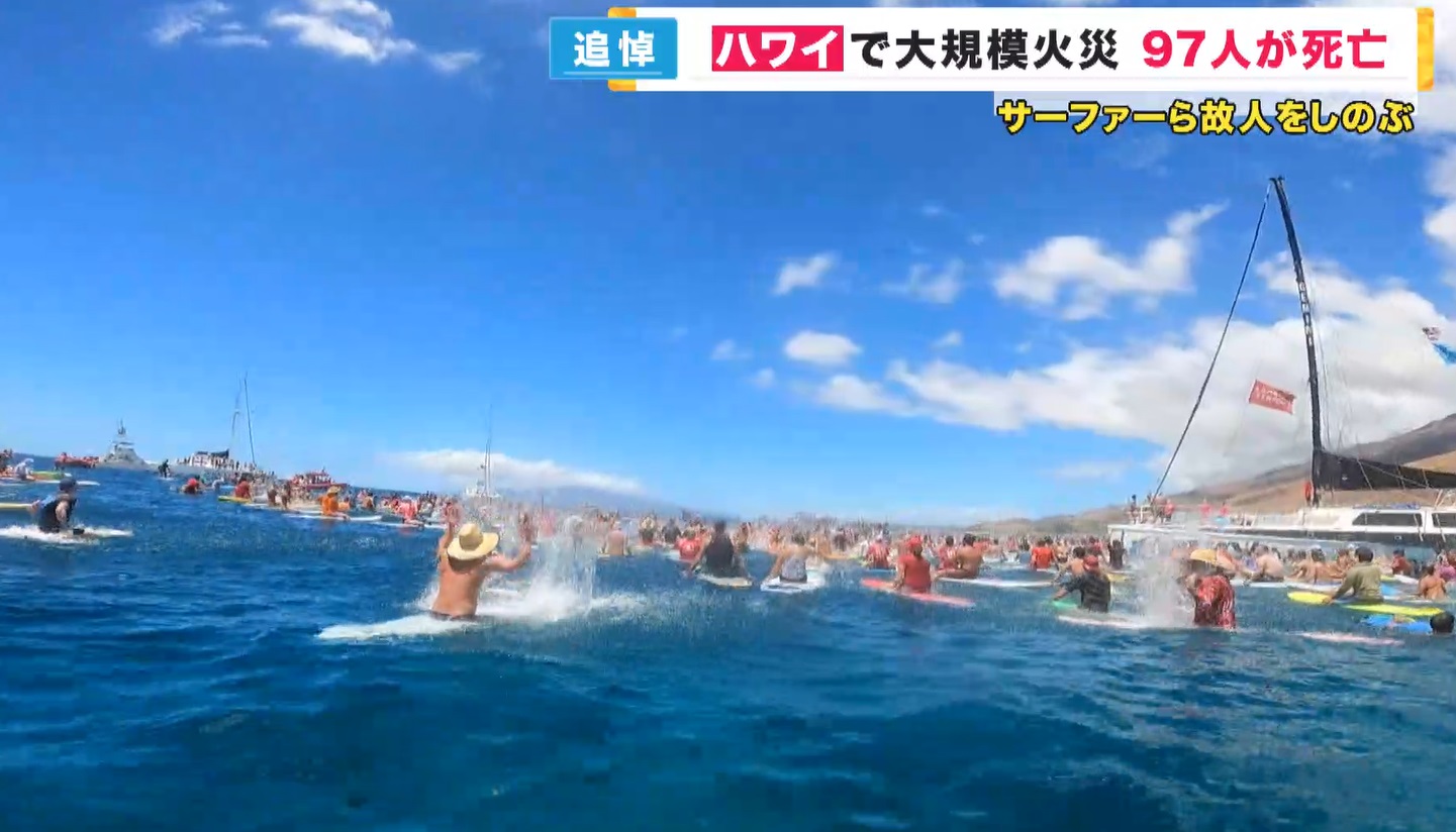 9月8日に行われたのは、ハワイの伝統的な追悼式「メモリアルパドルアウト」。マウイ島の海で、数百人のサーファーたちが沖に出て水しぶきを上げ、山火事で死亡した人たちを追悼しました。