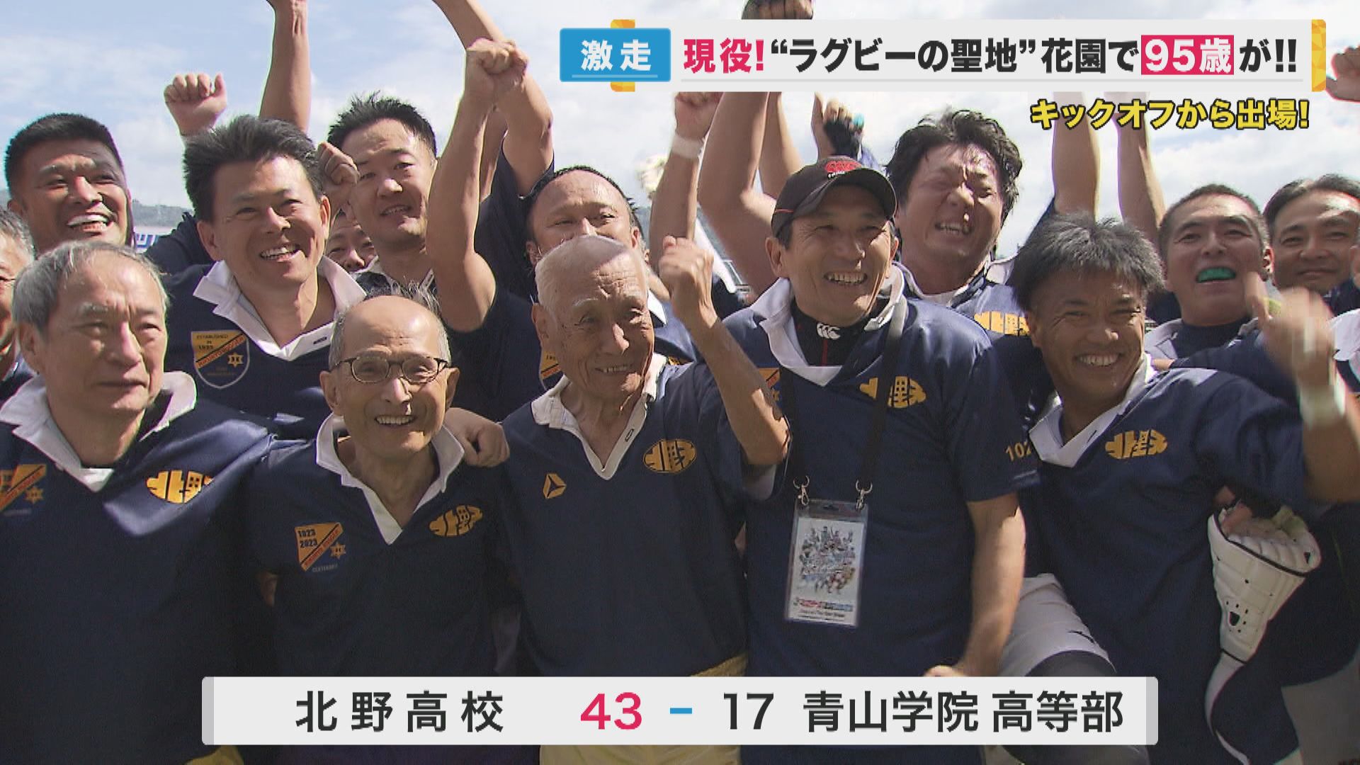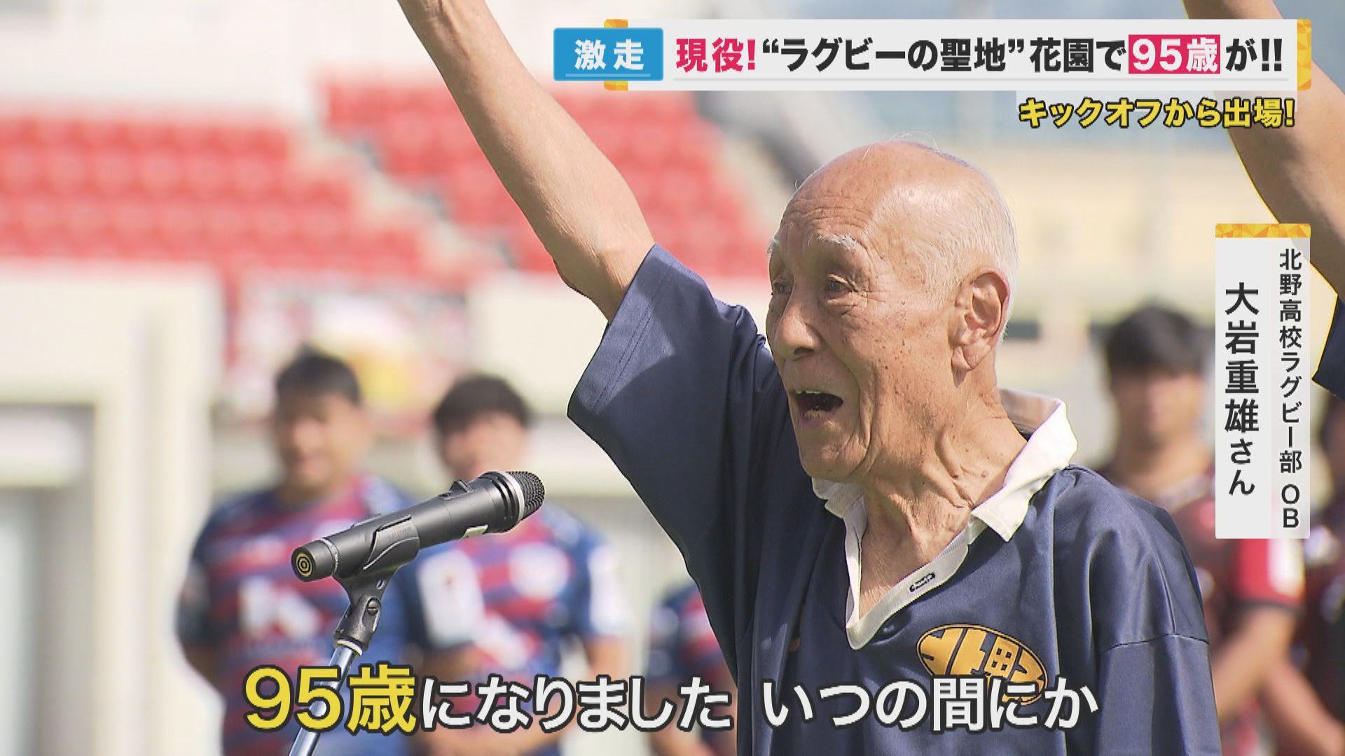 ラグビー部のOBたちが全国から集結する「マスターズ花園」が東大阪市の花園グラウンドで開催されました。 「宣誓、われら選手一同は…」と力強い選手宣誓を行ったこちらの男性、実は旧北野中学校ラグビー部OB、大岩重雄さん、御年95歳。