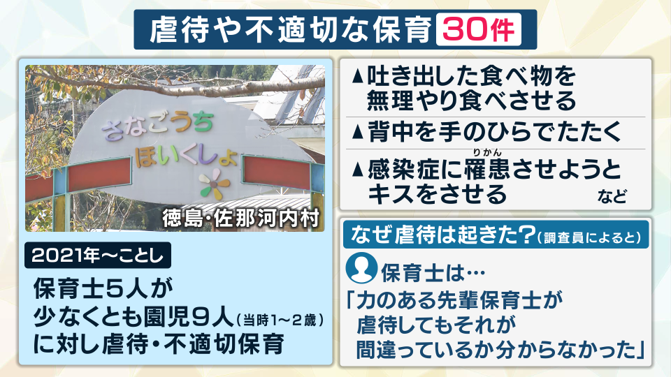 “こぼれた牛乳飲ます” “吐いた物食べさせる”“感染症の児童とキス” 保育所で虐待や不適切保育など30件発覚 徳島・佐那河内村