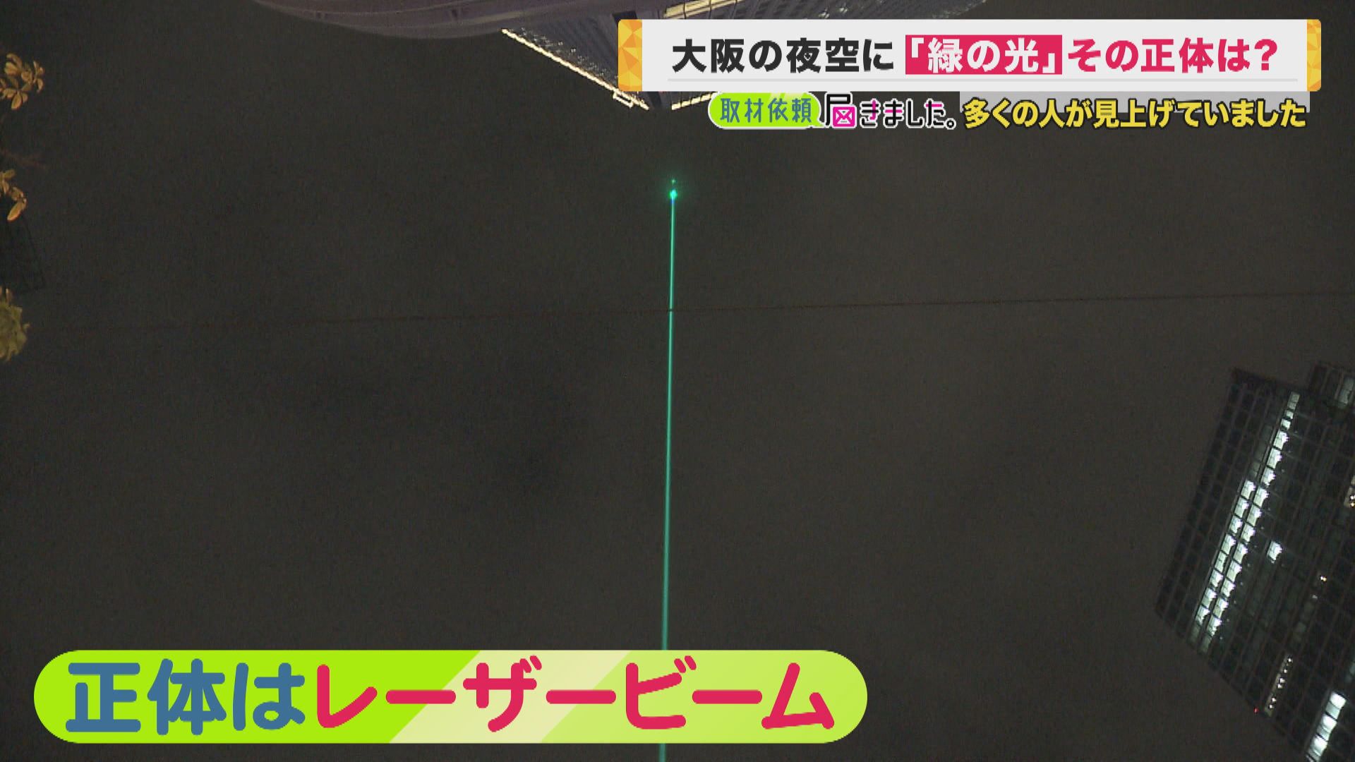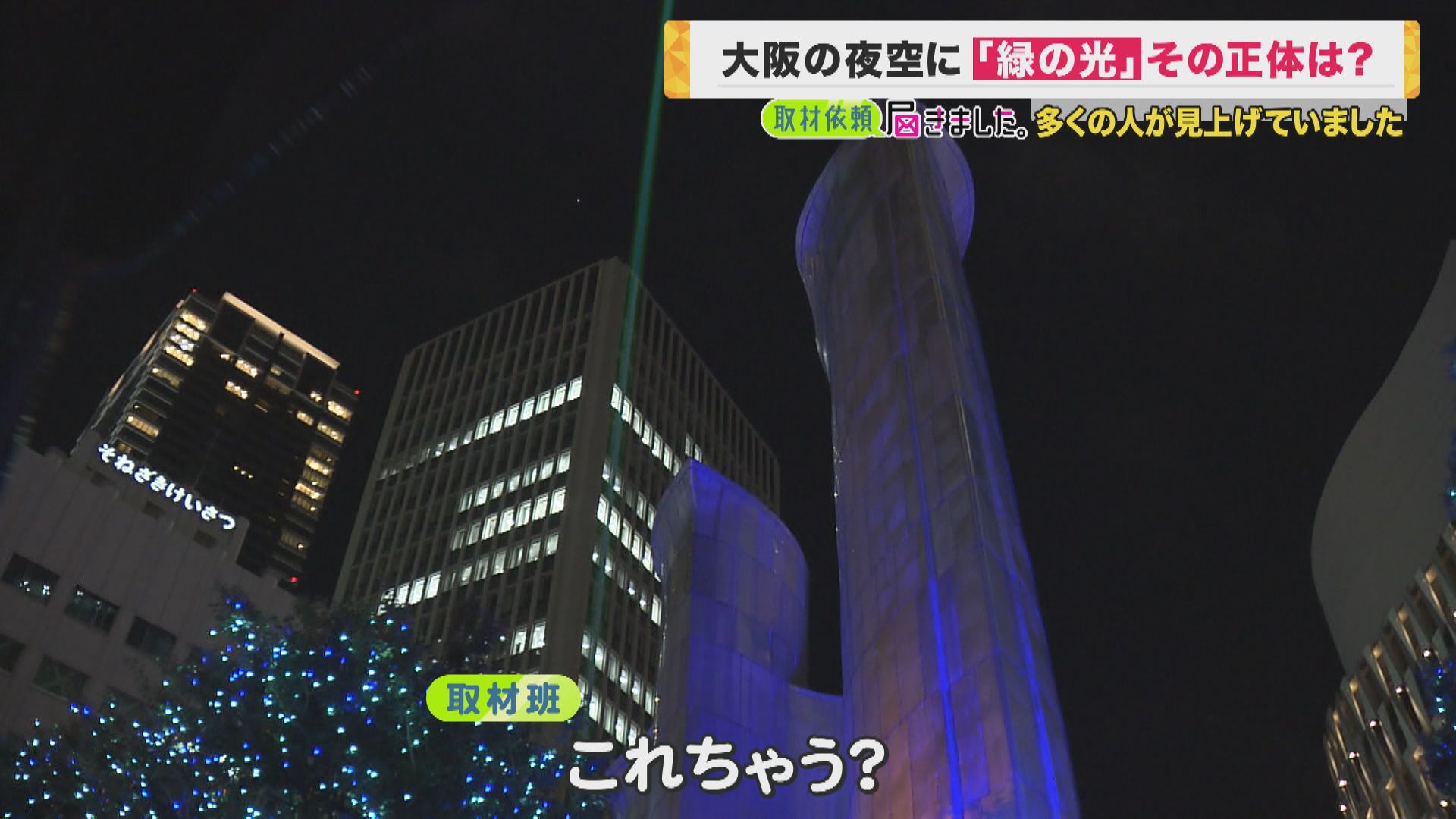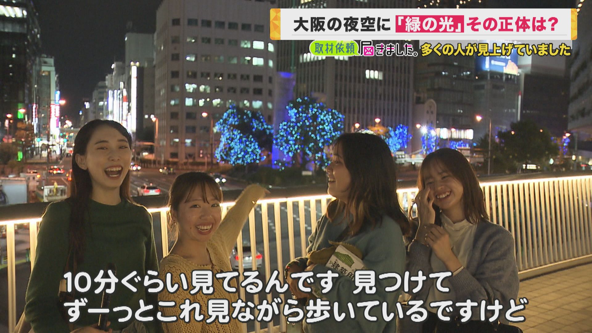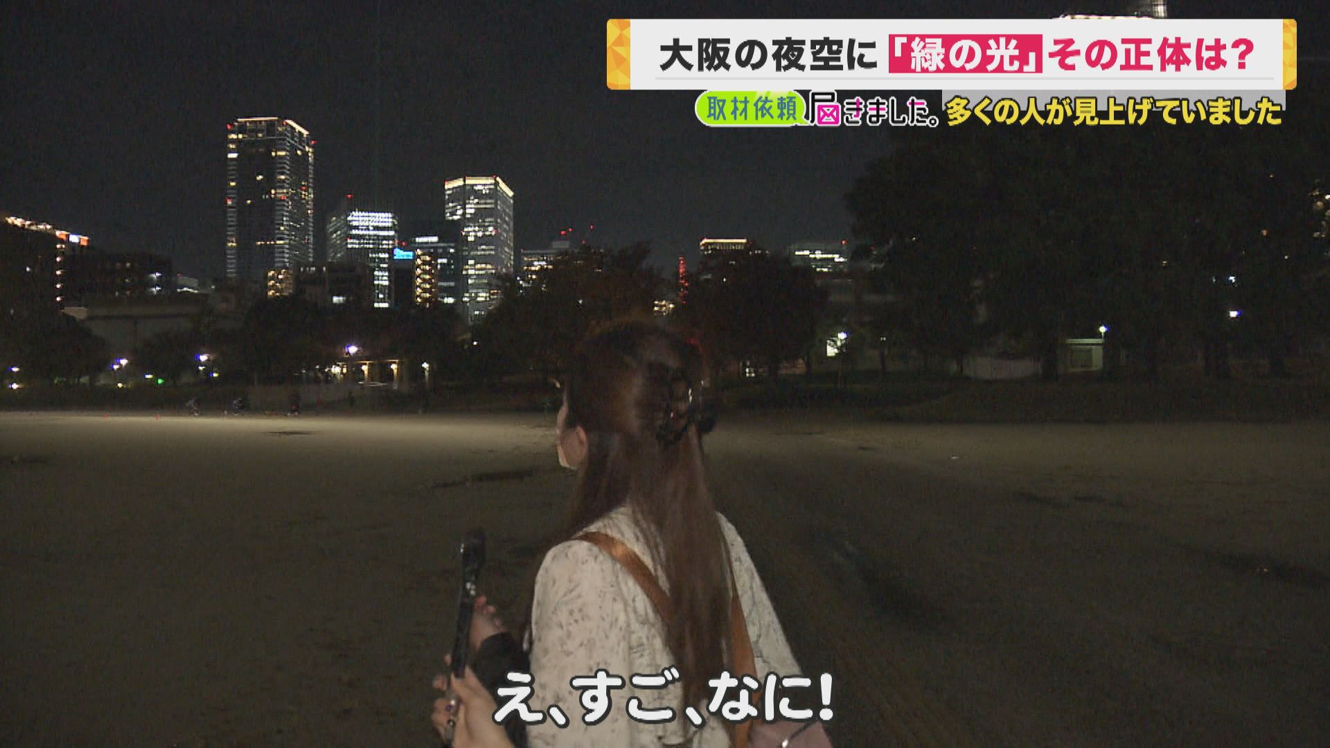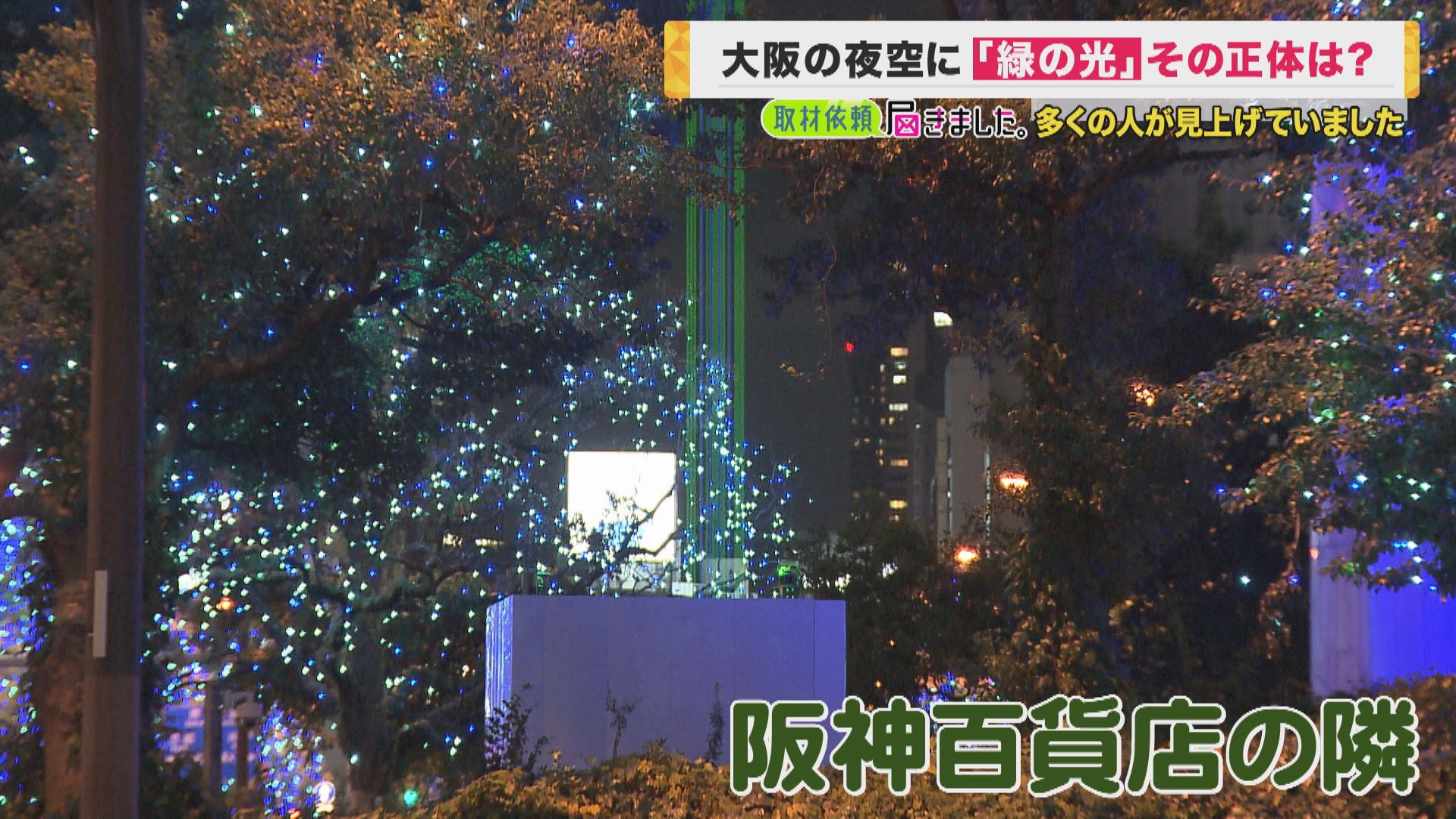 11月6日の夜、謎の緑の光が大阪・梅田付近に現れました。関西テレビにも投稿が寄せられ、この光の正体を探して来ました。 取材班が会社を出たのは6日午後7時半ごろ。さっそく空を見上げる人たちを見つけました。